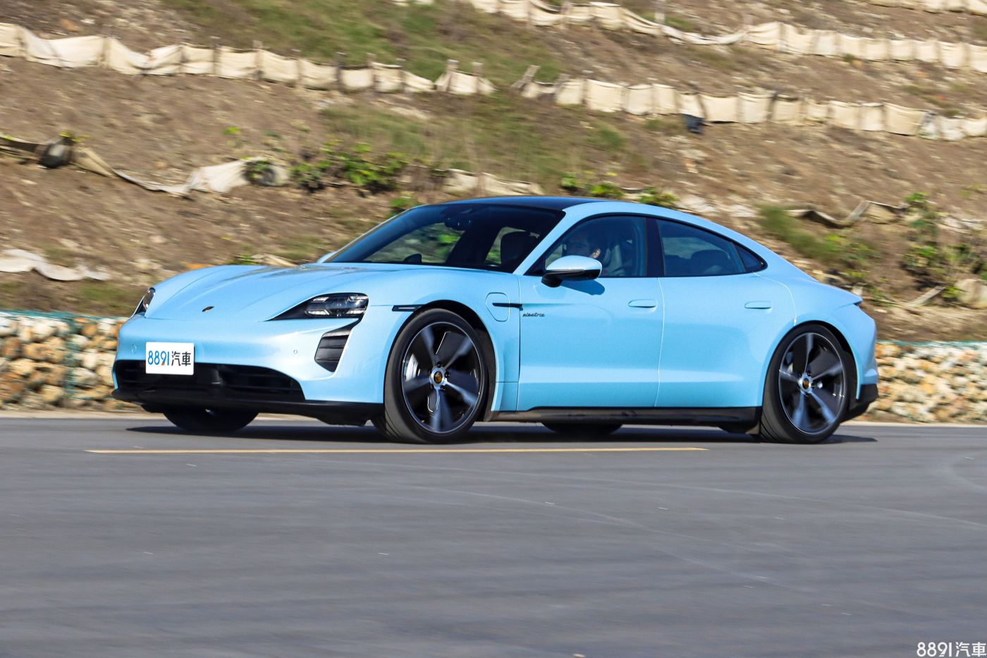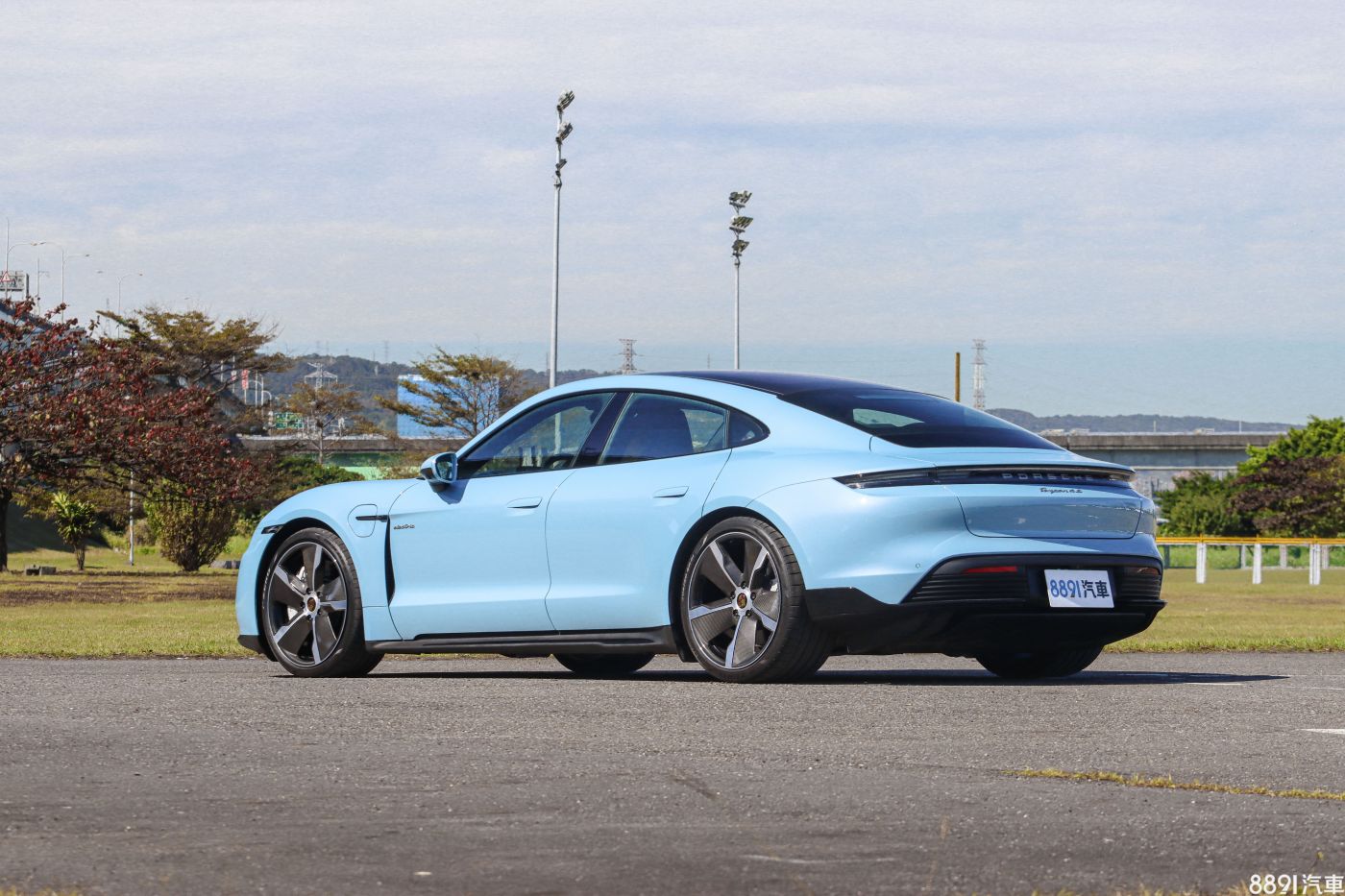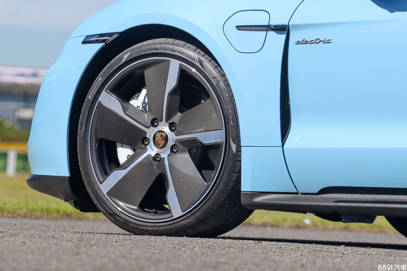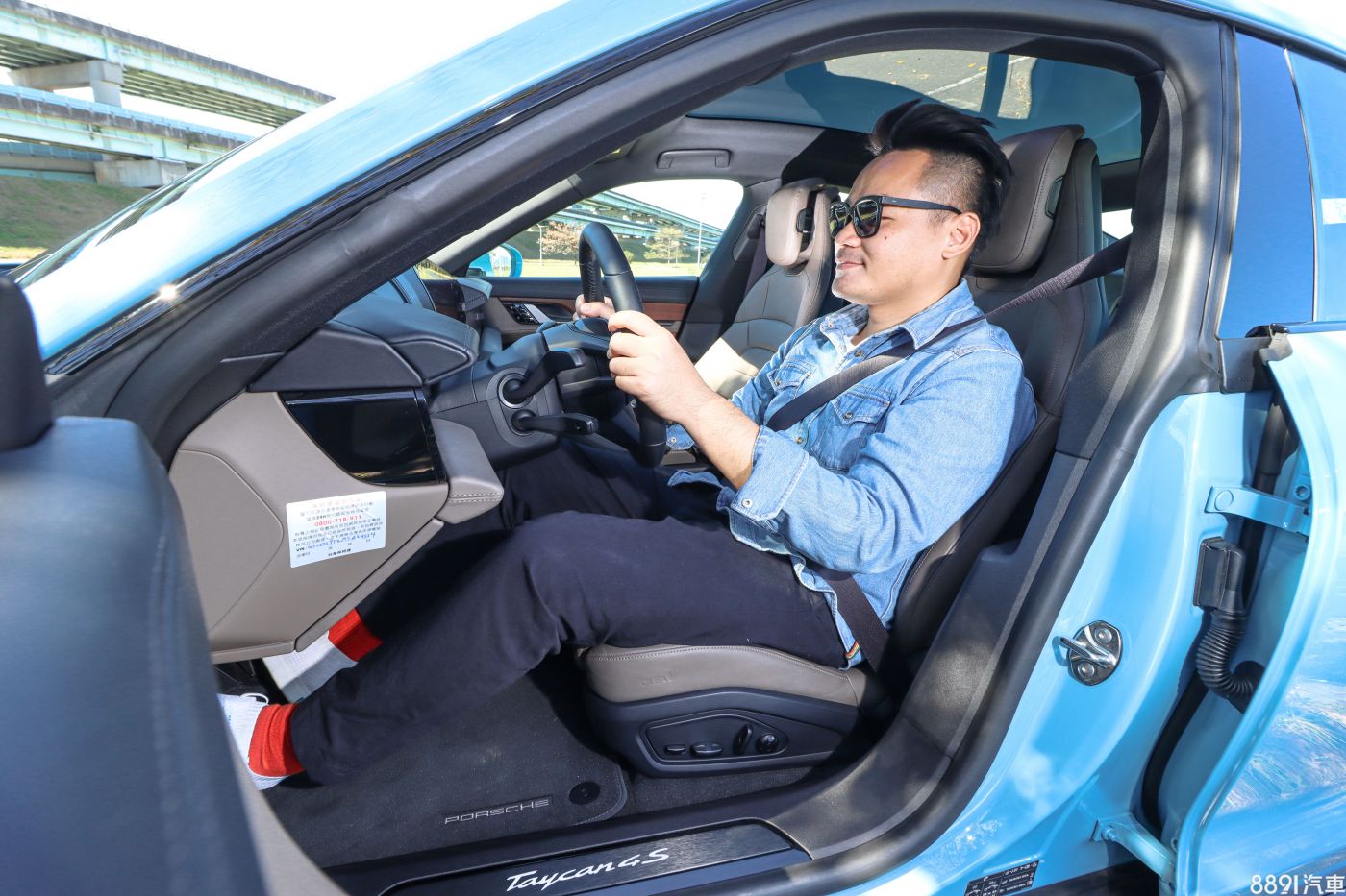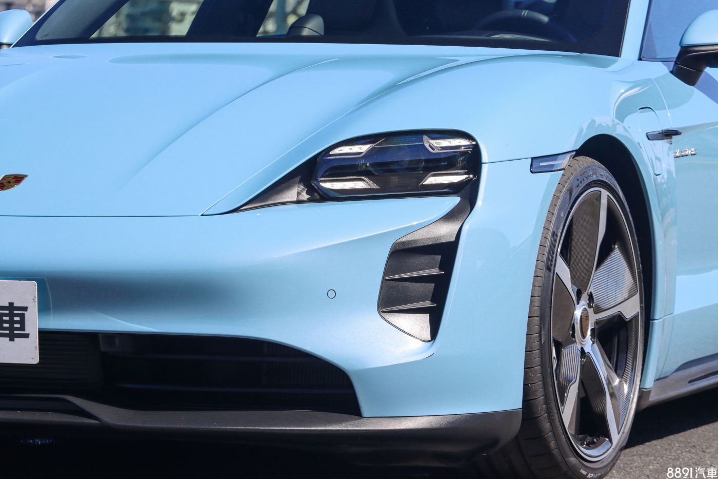 這輛Taycan 4S選擇金屬冷冽藍車色(加價6.97萬),乍看是一般水藍色,但陽光下相當耀眼奪目,同時也選配高亮澤黑色SportDesign外觀套件,前保桿兩側進氣口造型加大,側裙也加上亮黑點綴,乍看差異不大,但若與標準版對比,確實有效提升視覺張力。