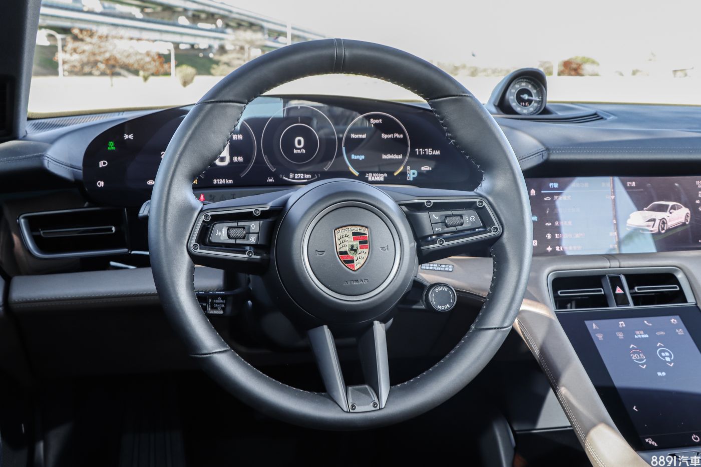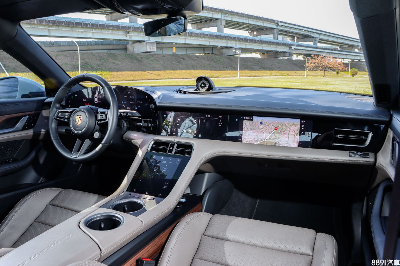Taycan中控台盡可能取消實體按鍵,大部分功能都由觸控螢幕操作,基本就有16.8吋數位儀錶、10.9吋PCM多媒體系統和8.4吋的中央鞍座螢幕,試駕車則加上6.52萬元選配的10.9吋乘客座顯示幕,等於前座有4組螢幕的狀態,忠實傳達電動車的高科技感受。
