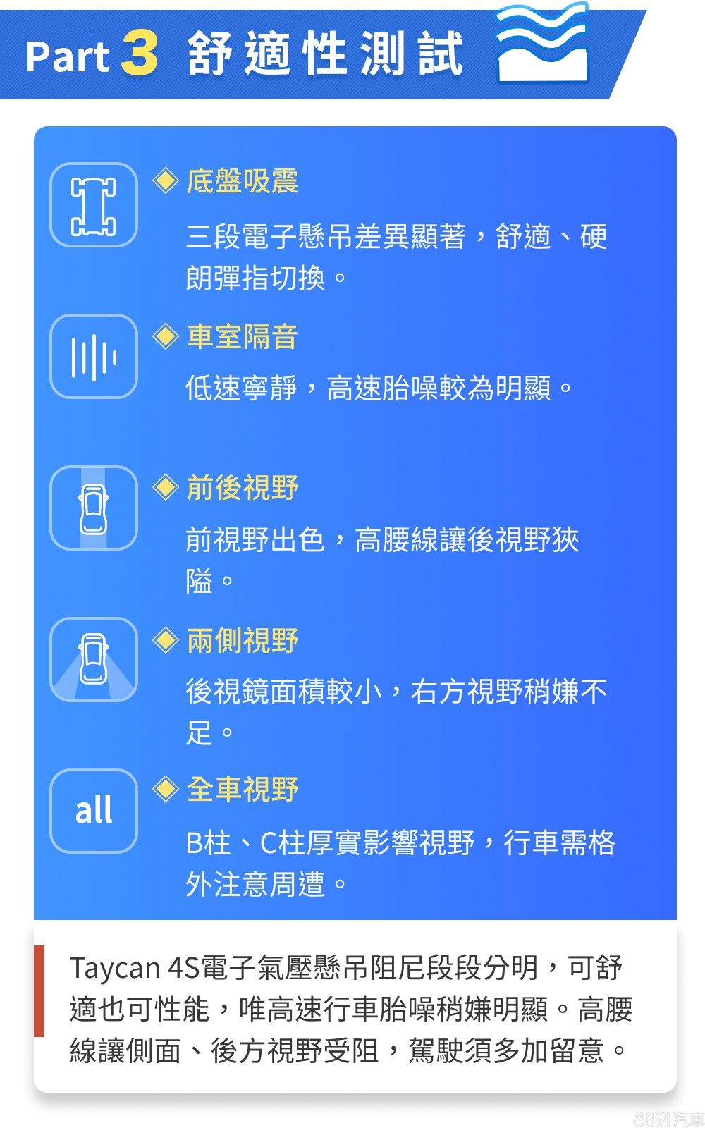 超級測試內容訴求全方位,對於一輛「四門跑車」而言,Taycan空間與舒適性確實吃虧了些,坐姿貼地、座艙包圍感強,後座也稱不上開闊,甚至是隔音表現也是一般。但關於詮釋跑車靈魂這檔事,Taycan性能表現確實嗆辣!不只是加速夠快、實測表現優於原廠,操駕感受與實際表現,都是札實的高性能水準,Taycan徹底體現環保與樂趣並存的可能性,依然擁有跑車靈魂,就像是多了後門、少了嘶吼聲浪的「電動版911」!