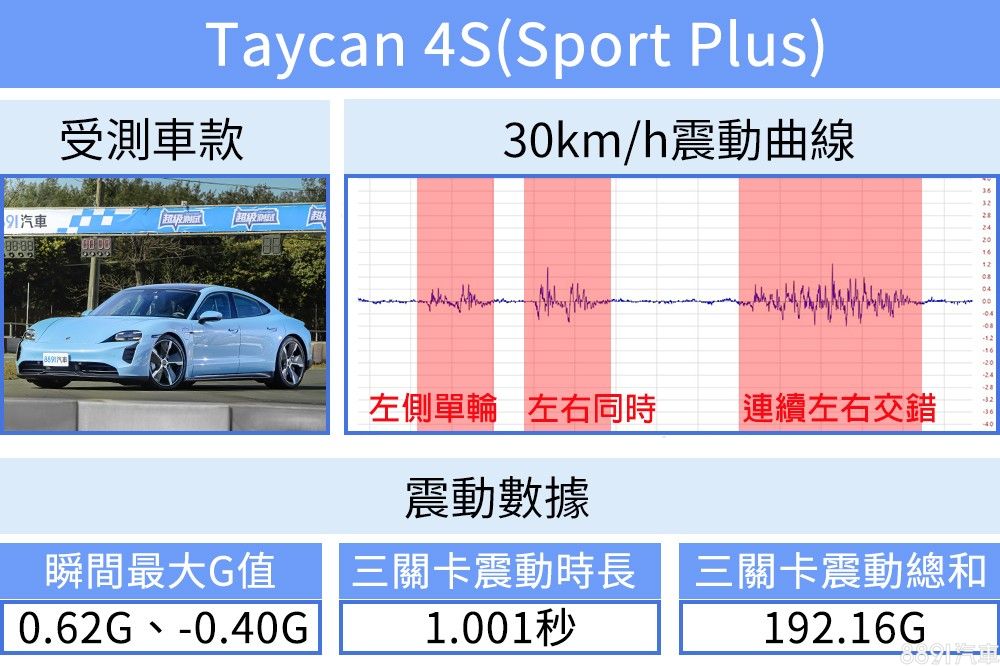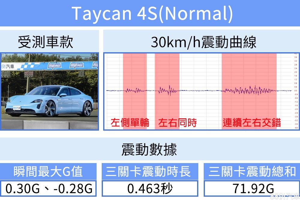 對比三模式在30km/h的測試數據,Normal模式G值最低、時長最短、震動總和也最小,代表車內感受到的衝擊最小,也最能吸收路面震動回復車身平穩,相對Sport Plus則是衝擊感受最直接,段段分明的懸吊模式讓Taycan在動靜之間有著截然不同的性格。