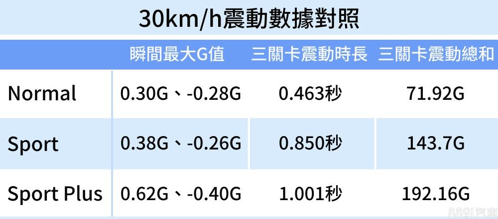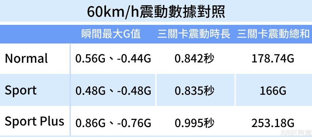 Sport模式下雖然G值、震動總和比起30km/h略增,但較強韌的阻尼設定依然能讓車身快速回穩,衝擊力(G值)與震動總和反倒比Normal模式略小一些,也就是說一般車速下,Sport模式比起Normal模式要更平穩舒適。