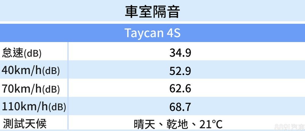 以一輛「電動車」而言,少了引擎,怠速比燃油車安靜很正常,主要還是要看動態時的隔音表現,Taycan 4S的風切聲抑制得宜,但畢竟仍是低底盤跑車,且用上前265mm、後305mm胎面的高性能胎,不免仍有路噪、胎噪傳入,實測高速68.7dB表現較一般。