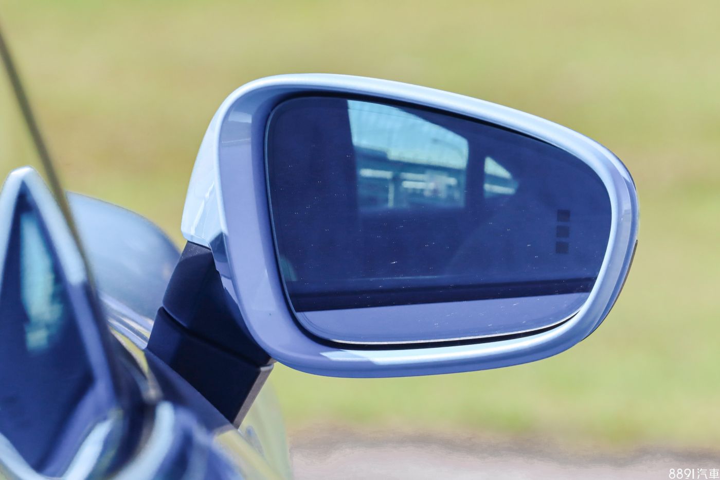 Taycan後視鏡造型偏小,且兩邊都沒有廣角鏡設計,左側視野倒還好,右側僅19.1°視野就狹窄許多。盲點偵測顯示就直接在後視鏡面上,能夠直觀的達到提醒效果。