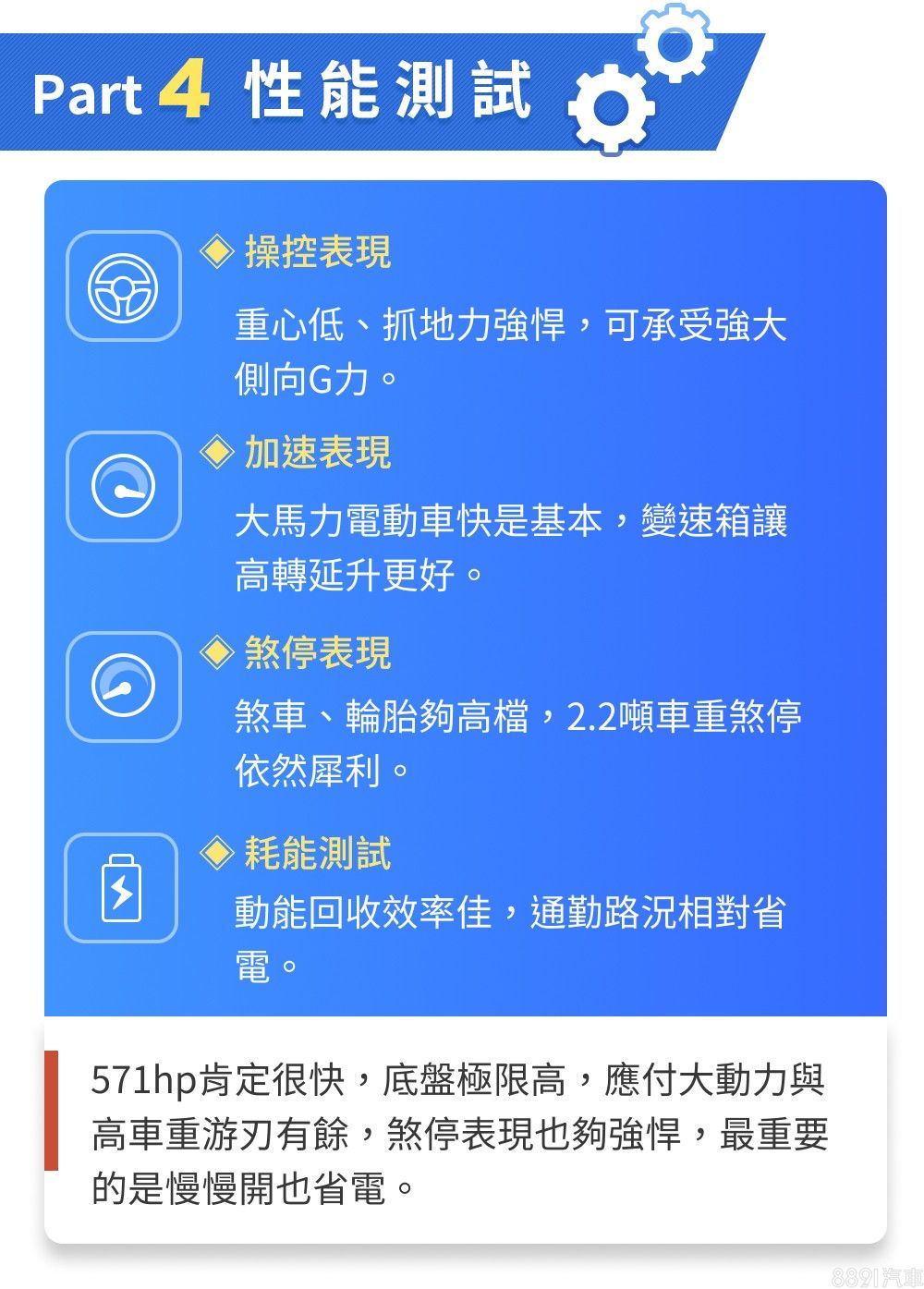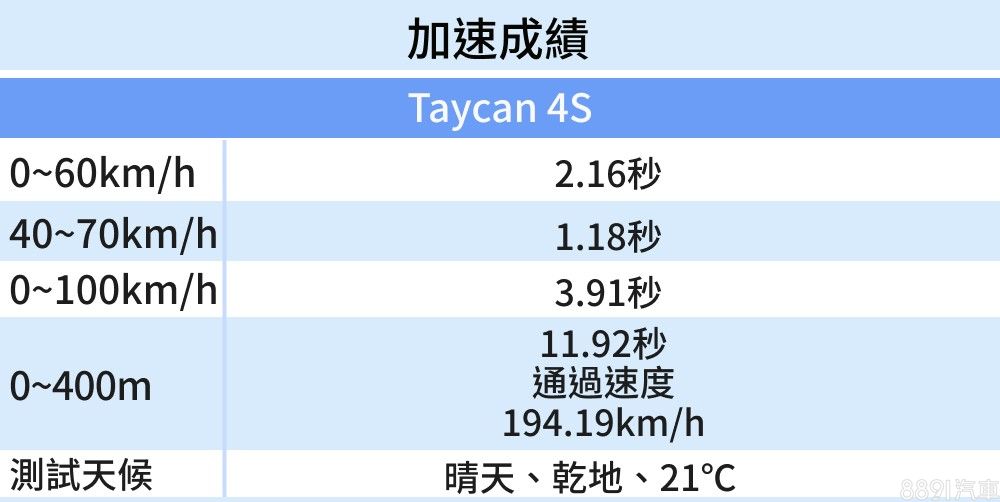 實際進行加速測試,在前後雙馬達、四驅加持下,起步並無任何打滑產生,於0~100km/h加速成績為3.91秒、初段加速力道0.9G,即使以電動車來看也是夠快。但厲害之處在於高速延續性,破百後衝刺力道依舊帶勁,就算只是「4S」車型,0-400m也有11.92秒、末速194.19km/h的優異成績,2檔變速設計,對比一般單速電動馬達,高速衝刺表現更好!