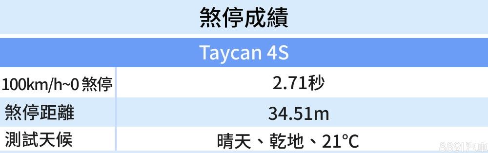 這輛Taycan 4S選配了PSCB煞車套件,特點是碟盤表面處理為高硬度碳化鎢塗層,加上動能回收系統提供的減速力道,實測下來全力煞停距離僅34.51m,性能車表現無誤。於一般操駕時煞車腳感線性好控制,也不容易察覺動能回收機制介入,但在全力煞停狀況下踏板行程有些過長,需稍加適應。