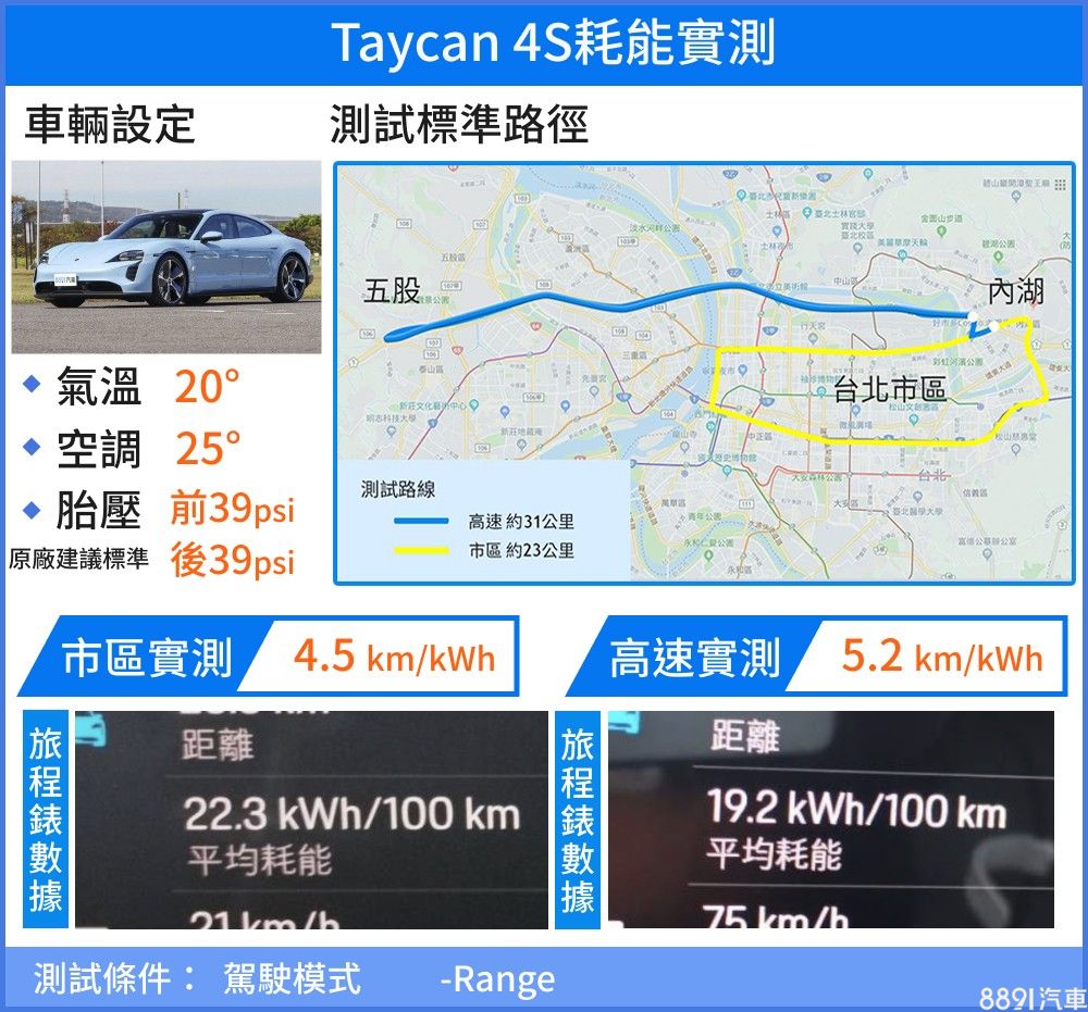 測試路況順暢,以Range模式進行,這時車輛自動降低車高、升起尾翼,空調功能也連帶進行調整,甚至是副駕駛座螢幕也跟著關閉,進而達到「節電」效果,成績與過去實測的I-Pace、Model X Long Range差不多,市區與高速每度電分別可行駛4.5km、5.2km,只要減少猛烈加速,並盡量以動能回收系統減速,行駛成本怎樣都遠低於傳統燃油車。