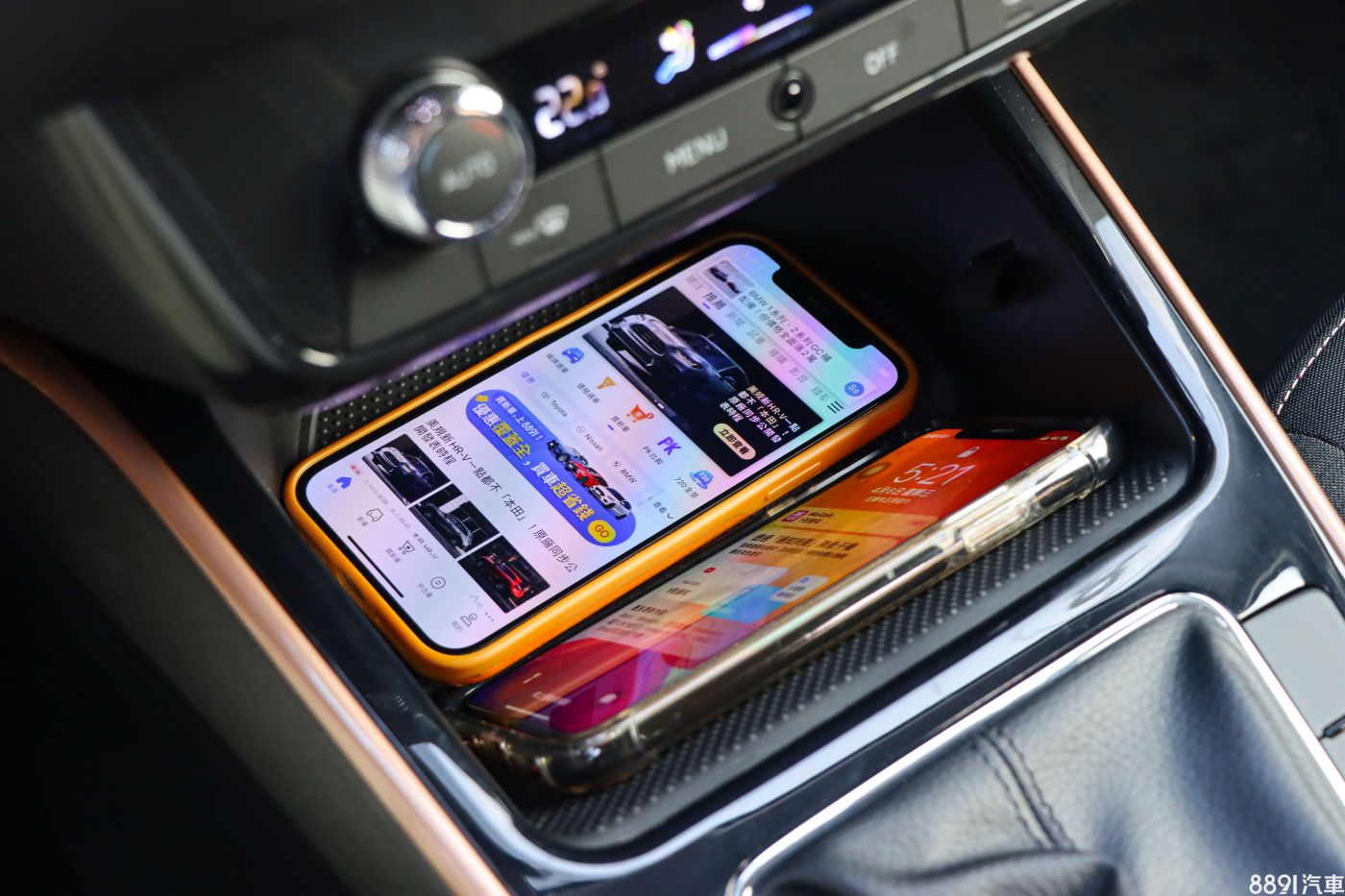 排檔座前方的置物空間相當寬敞,平放兩隻手機不成問題,前方另備有手機無線充電板,擺放手機時會自然斜下固定,並不會在開車過程中因左右晃動而沒充到電。