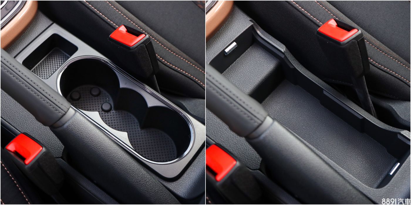 排檔座後方設有多功能置杯架,可容納得下兩大一小的寶特瓶,如圖所示,不用時也能將其拆卸下來,轉變為可靈活運用的開放式空間,擺放小件雜物或鋁箔包類飲料都很好用。