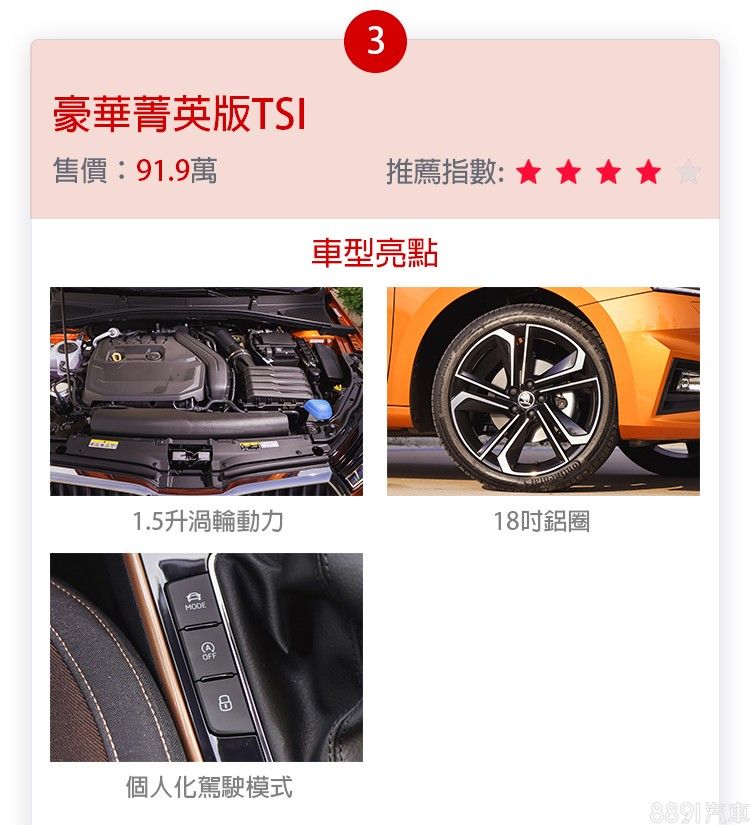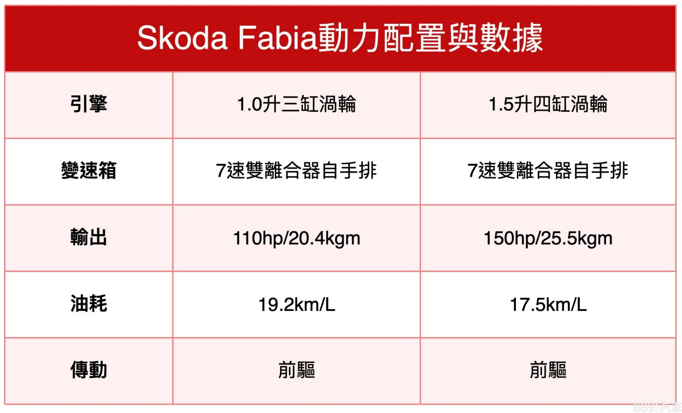Fabia共有三種配備等級、兩種動力選擇,動能版與豪華動能版兩者搭載1.0L動力,以配備來說,只要買到「豪華動能版」就已經是大滿配了,因此最推薦給普羅買家選購,五星推薦 !至於攻頂豪華菁英版,實用配備與豪華動能版近乎相同,只差在多了1.5L動力、18吋鋁圈、駕駛模式選擇,獻給部分喜歡動感、在意性能的買家。