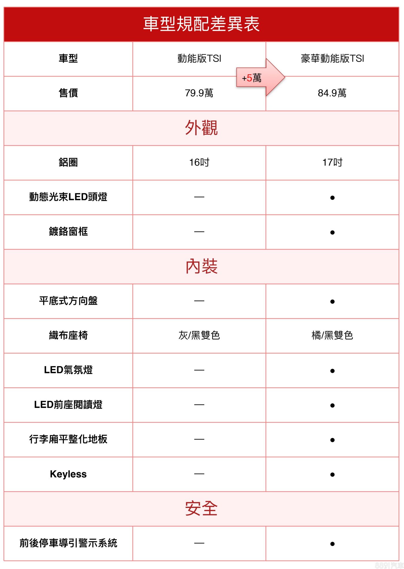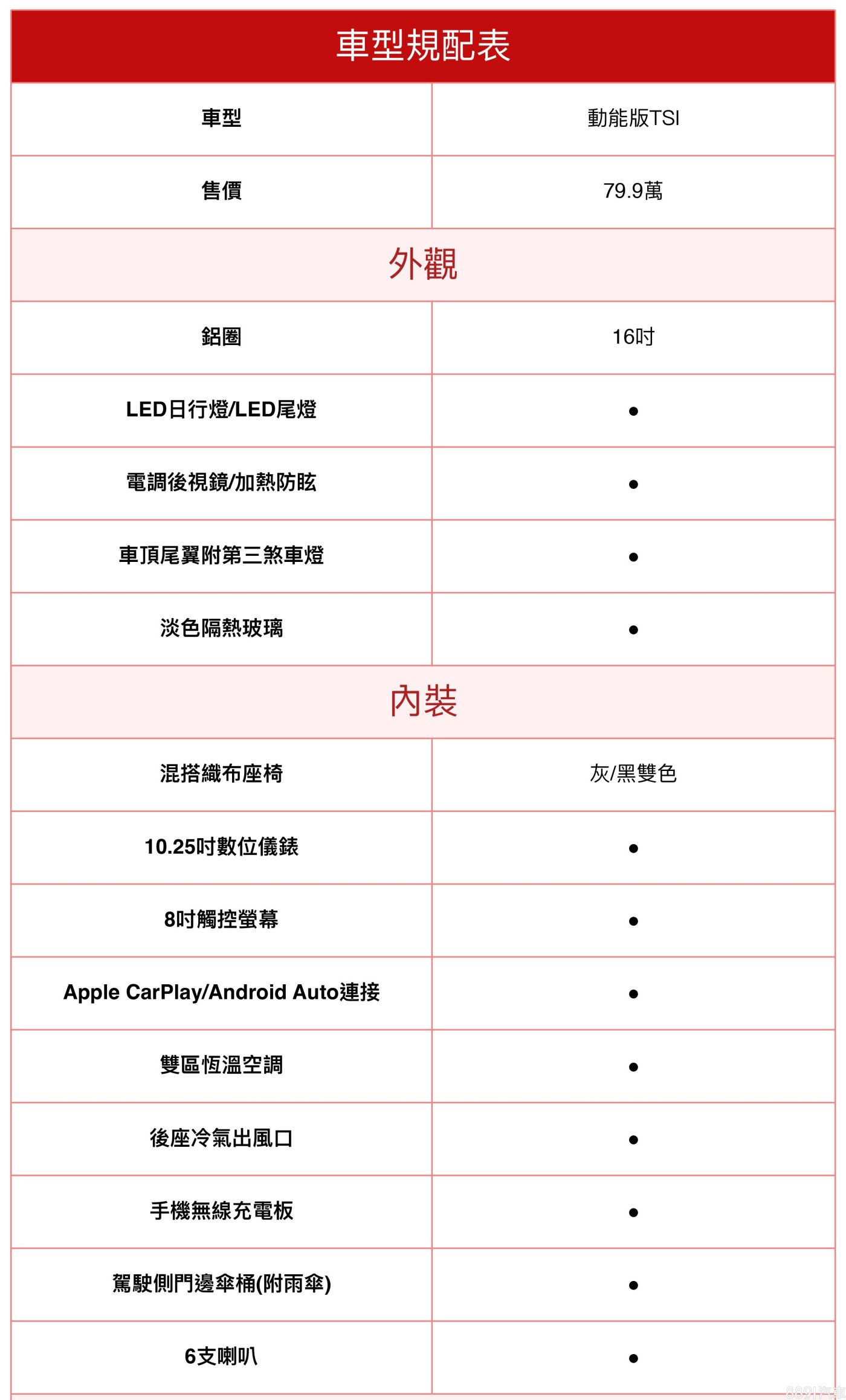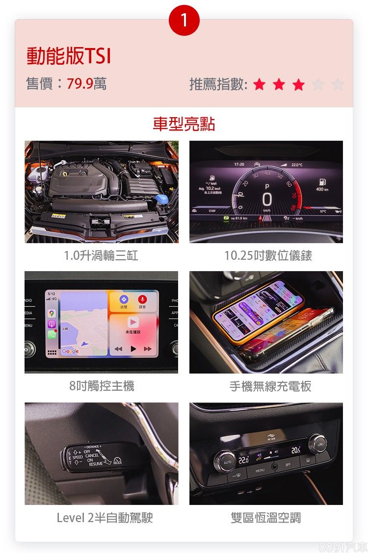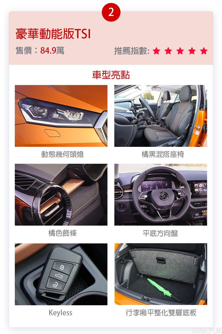 Fabia入門配備就給得很齊,像是半自動駕駛、數位化座艙、無線充電等通通給你,這些都是印象中在他牌需中高階才有的配備,以實用性角度來說,入門即滿配,頗有誠意,但多花5萬買中階「豪華動能版TSI」我認為才是完全體,多了高階頭燈,內裝配色也更活潑,配備攻頂、視覺到位,整體C/P值表現最高。至於動力部分,以個人經驗分享,該1.0L動力表現輕快,官方公佈加速性能表現也不輸同級,除非你真的很喜愛性能,否則無需多花7萬攻頂,買「豪華動能版TSI」已有面面俱到的表現。