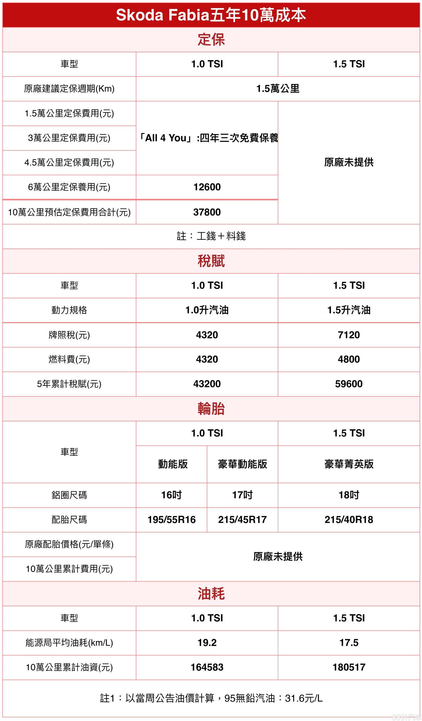 這次定期表養僅表列1.0L動力,原廠表示1.5L保養價格仍在研議調整,暫不提供。以表列數值可以明顯看出,就稅賦、油耗表現來看,1.0L版本經過5年10萬公里加總下來,確實比1.5L版本省下不少錢,適合精打細算的Fabia買家。