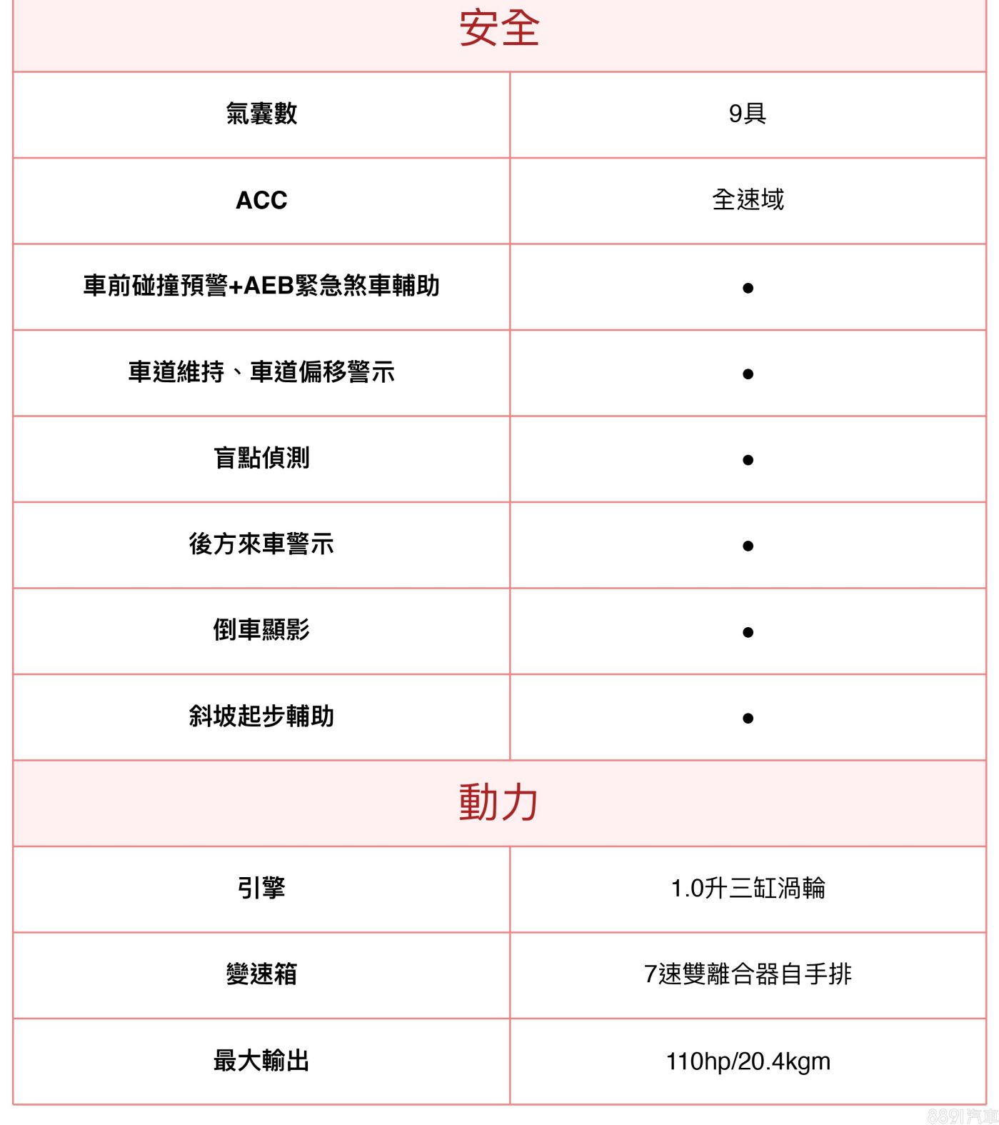 兩種動力各有特點,1.0L渦輪動力擅長節能表現,汽缸壁採用奈米塗層技術,以減少活塞摩擦力,官方油耗為19.2km/L,看到輸出表現110hp/20.4kgm也別太擔心,其實也足夠小車使用,官方公佈0~100km/h加速為9.6秒,在同級中已是中等以上水準。