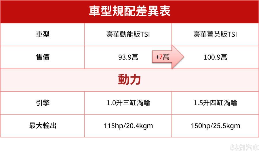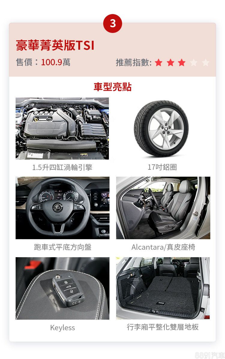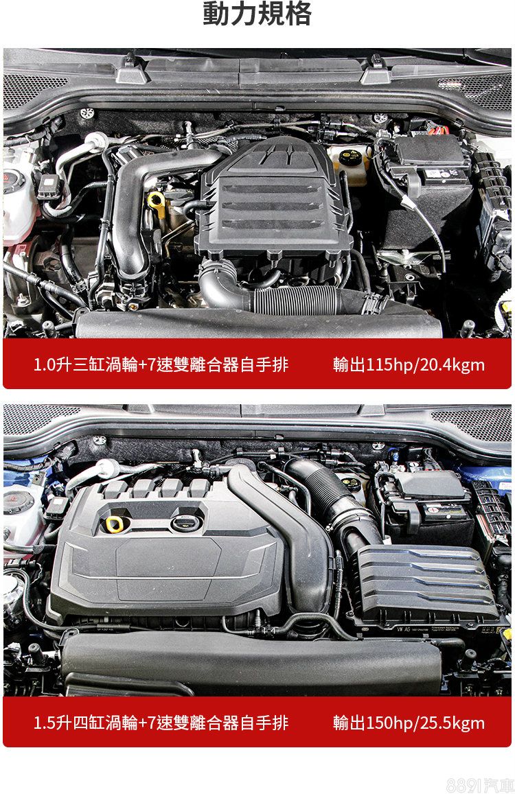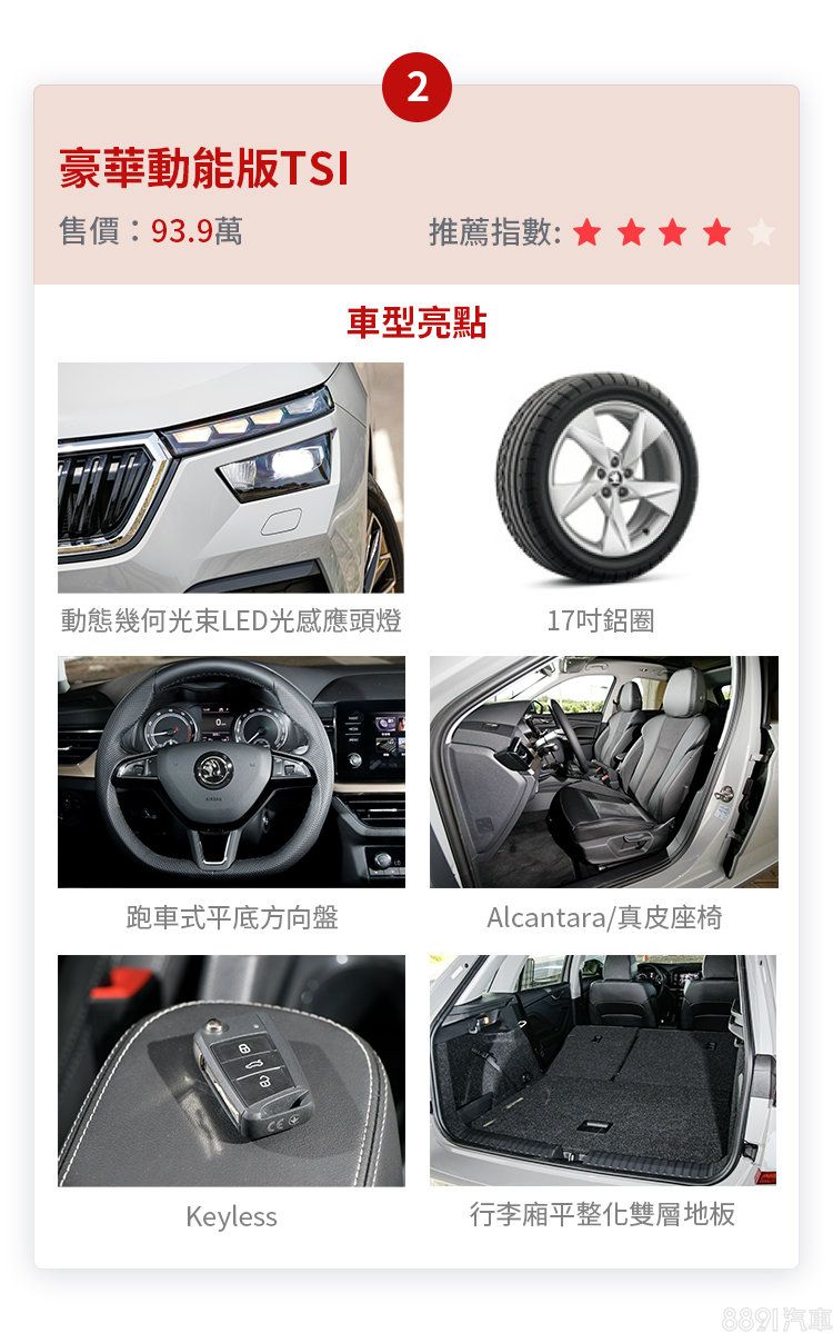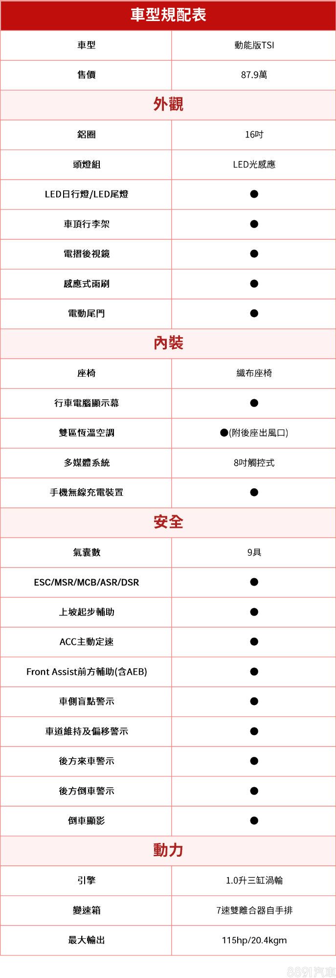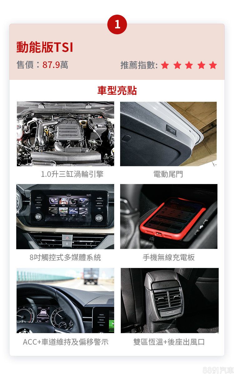 最入門的動能版就已經將LED頭尾燈、雙區恆溫空調、手機無線充電板及倒車顯影等列為標配,攸關舒適便利的電動尾門及後座出風口更是此級距同價位中罕見的配備。此外,標配的主被動安全項目包含AEB、全速域ACC、車道維持及盲點偵測及9氣囊等,與高階車型幾乎無異。而1.0升三缸渦輪引擎搭配7速DSG變速箱的動力設定足以應付代步需求,論經濟性及C/P值都是三車型中最推薦者。