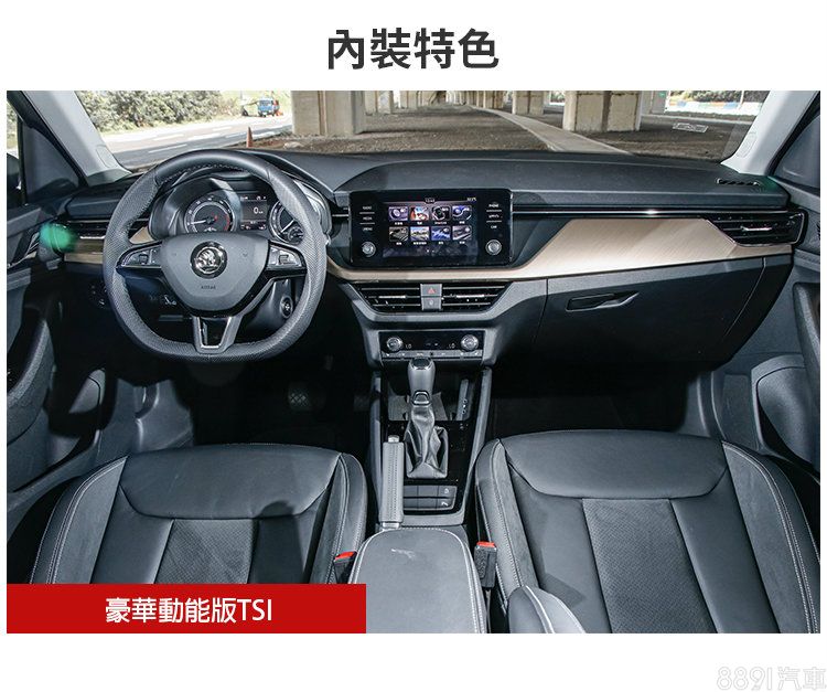 內裝沿用Scala的新世代架構,以簡潔的水平中控台搭配8吋懸浮式多媒體觸控螢幕,操作直覺且易於上手。豪華版採類木紋亮面飾板點綴其中,並搭配跑車式平底方向盤,視覺效果更上層樓,且內裝各處用料頗為紮實,細節處理到位,不會給人陽春廉價的感受。全車系另提供全景式玻璃車頂(4萬元)及數位儀錶(3萬元)作選配,可增添更多豪華享受。