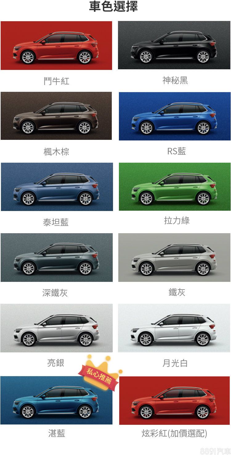 原廠提供多達12種車色供車主選擇,除炫彩紅之外皆不用加價選購。其中不乏黑、白、灰等安全牌,也有紅、綠、藍等亮色系。私心推薦湛藍,可襯托Kamiq的動感風采,且又是唯一與Scala不重複的塗裝。