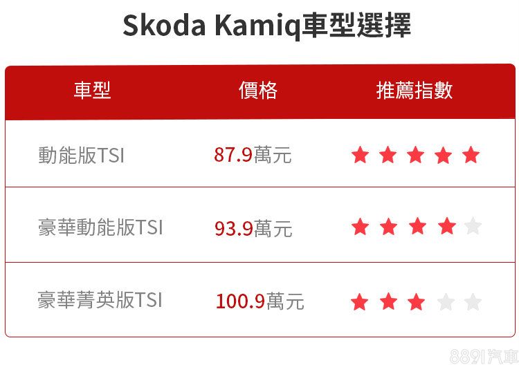 最初引進時,Kamiq車系編成規劃其實與Scala相同,採1.0、1.5 TSI兩種動力,並區分動能版、豪華動能版、菁英版及豪華菁英版共4車型,售價落在87.9~100.9萬元。不過原廠在日前表示,原定售價95.9萬元的菁英版於8/1起停售,因此車系編成縮減為3車型,售價不變。