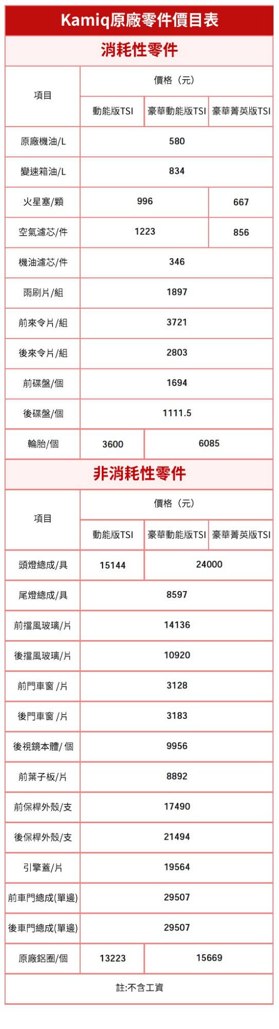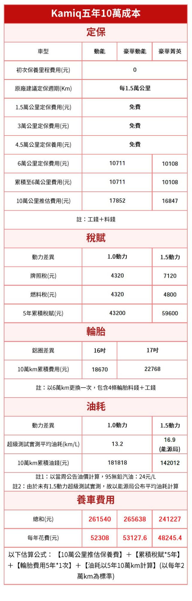 原廠保養在6萬公里之前都屬免費,此部分車型之間差異不大。有感差別在於稅賦及輪胎,前者5年累積下來就可差到1.6萬元以上,後者因17吋輪胎的緣故,換胎成本就跟著提高。零件部分主要也是差在圈胎組價格,以及豪華版所配備的高階LED頭燈總成相對較貴。