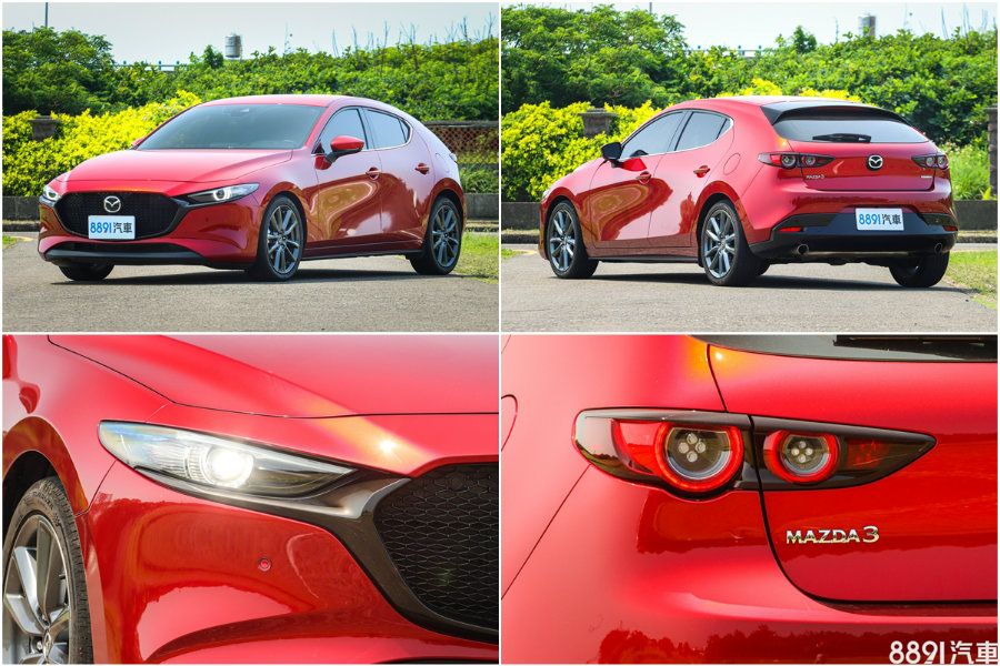 Mazda3五門版的外型圓潤,採用亮黑水箱罩,車頭視覺帶有侵略感,和四門版本的鍍鉻樣式有明顯風格差異,車身上沒有明顯的鈑件折線,厚實的C柱造型是此車外觀一大特色,算是蠻大膽前衛的設計,配合四環式尾燈,一樣是肅殺的神情,燈具部分,Mazda3五門版為同樣規格,頭燈採用全LED光源,具備主動轉向與智慧型遠燈啟閉功能,尾燈也同樣是全LED配置。