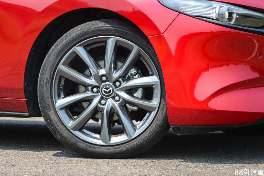 Mazda3五門版一律採用此款槍色18吋鋁圈,配胎尺碼為215/45R18,和Scala同樣是普利司通Turanza T005,對於運動化性格的Mazda3來說,若要強化操控還是有升級性能胎的必要性。
