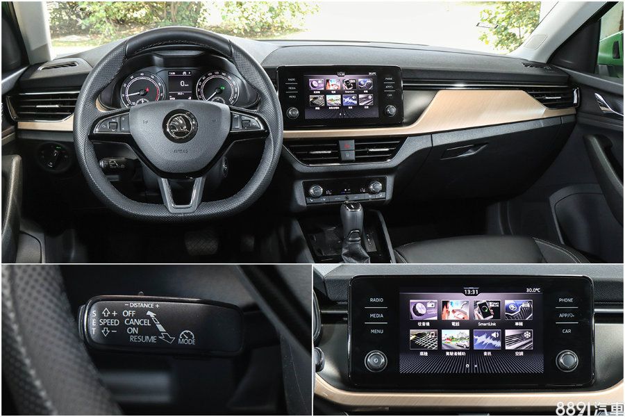 車室以能夠增提升空間感的水平線條為主,豪華版採用亮面類木紋飾板,讓深色內裝多些視覺焦點,質感方面稱不上豪華,還是同場唯一沒有電子手煞車,不過細節的鍍鉻材質點綴加上精緻的門把設計,不至於讓人感到陽春,全系標配的8吋觸控多媒體系統首度使用中文化介面,除了沒有內建導航之外,功能完整,圖像化介面簡約易懂、流暢度佳。如果是第一次接觸VW的定速撥桿,需要多些時間習慣,熟悉後還算好操作,只是不比放在方向盤按鍵區來得便利。