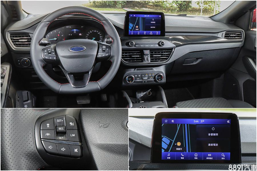 扁平化的中控台設計帶來開闊感,雖然是比較中規中矩的對稱式設計,但平底式方向盤、紅色車縫線和類碳纖維紋路飾板,還是能感受到此車要塑造的運動風格,用料部分多為硬質塑料,質感只能算一般般。SYNC3多媒體系統以觸控方式操作,功能性是四車最完備,有內建導航、Apple CarPlay相關連結功能和聲控系統。Co-Pilot 360輔助系統是一大強項,功能差異可在下方表格清楚得知,相關介面均設在方向盤左側,使用邏輯容易上手。