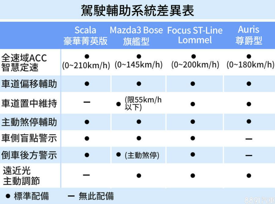 主動跟車方面,Focus與Auris兩者皆達Level 2半自動駕駛水準,相比Mazda3車道維持功能僅55km/h以下可開啟,還是Level 2等級在高速巡航時更便利;至於本次主角Scala在主動安全面稍嫌陽春,雖然有全速域ACC,但少了車道維持、主動遠光燈,相形之下功能、配備都齊全的Focus有誠意的多。