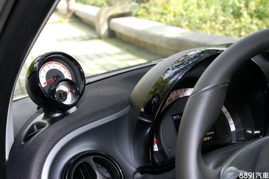 在排檔座有真皮包覆的排檔頭,質感一般,這次換上的6速雙離合器變速箱,提供Eco與Sport換檔模式,而前置杯架的設置在小巧玲瓏forfour上,還能保有空間彈性,還能放上660ml的寶特瓶但會有點不穩。