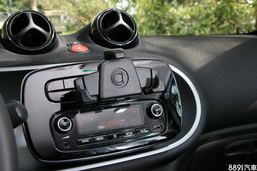 以現代人用車習慣來說,越來越倚賴智慧型手機與汽車本身的串聯,在forfour上便能看見貼心設置的手機托架,不用再任意擺放手機,而在托架下方有按鈕能延展支架,側邊還有一個USB插孔,不過只適用於3.5~5吋大小的手機,不須使用時還可卸除用圓蓋蓋住,而下方的音響系統看似一般,但該有的功能都沒少,支援AUX、USB、音樂串流與藍牙控制。