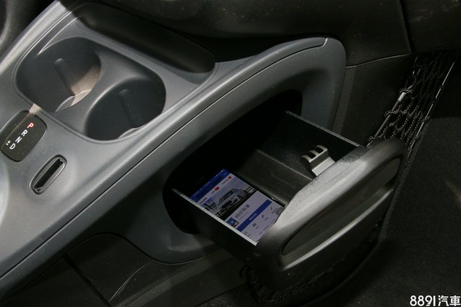 藏在前置杯架下方有一處收納空間,可從副駕駛座的位置打開,大約有可放入5吋手機的長度沒問題,或是要放上面紙也能,副駕駛座的腳部左側還有置物網,還能放入一些零碎物品。