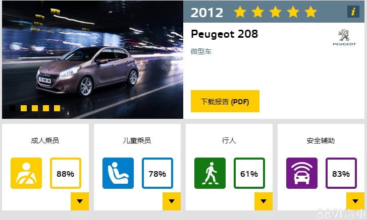現行世代的208已經邁入末期,大改款車型有望明年日內瓦車展亮相,目前國內的配置上,缺少像ACC+AEB這類主流配備,不過具有ESC、6具安全輔助氣囊等被動安全,符合基本水準。測試年份未將AEB納入評量,因此在現有配備下,在年度檢驗至2016年仍屬五顆星評價,整體來看,其行人、兒童與安全防護,都有將近80%左右的水準,算是相當高分。