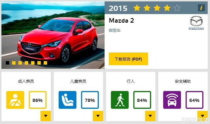 歐洲市場販售的Mazda 2,可選配輔助煞停系統,不過並非標配,因此未納入評量,而國內則是未能配置。各項成績來看,成人、兒童與行人防護,幾乎都有80%以上的得分,算是相對穩定的一組,年度檢驗至2018均維持四星等級。