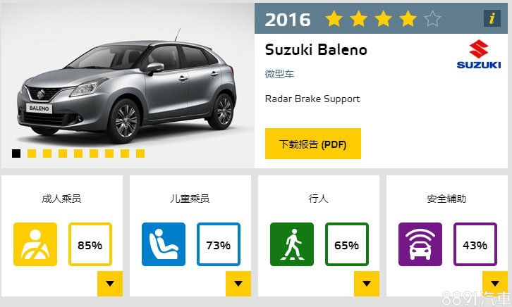 Baleno同樣在歐洲市場上,可選配輔助煞停系統,亦有標準與選配車型的兩份報告,國內無法配置。AEB系統獲得「優秀」評價,多數情況皆發揮避免碰撞或緩解的效果。