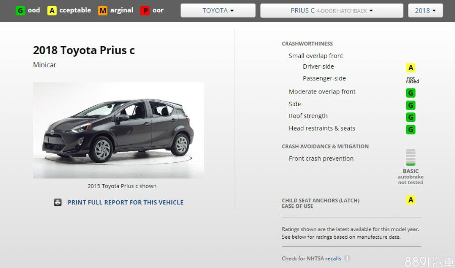 由於歐洲主要市場未販售Prius c,因此以美國IIHS成績作探討,就整體成績來看,小面積偏位撞擊在駕駛側得到「Acceptable」分數(副駕駛側未評比),其餘在正面偏位撞擊、側撞與車頂強度等均達到最高「Good」的等級。而輔助煞停系統未納入測試,僅在碰撞警告上有符合標準的分數。
