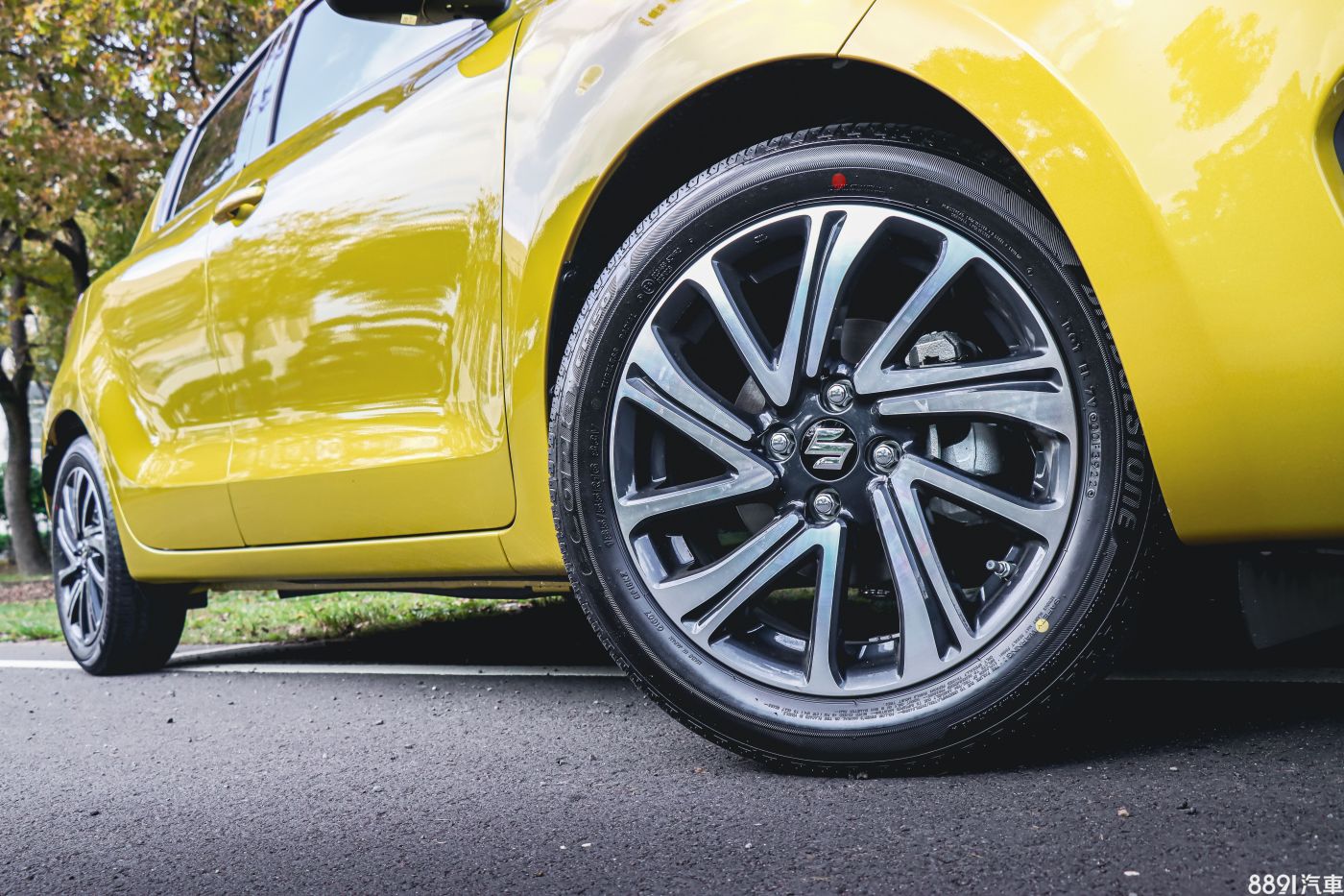 16吋雙色切削鋁圈採用旋風造型,替車側再添一絲動感,搭配輪胎為185/55R16普利司通Ecopia EP150,兼顧耐磨與舒適相當符合SUZUKI SWIFT的產品特質。