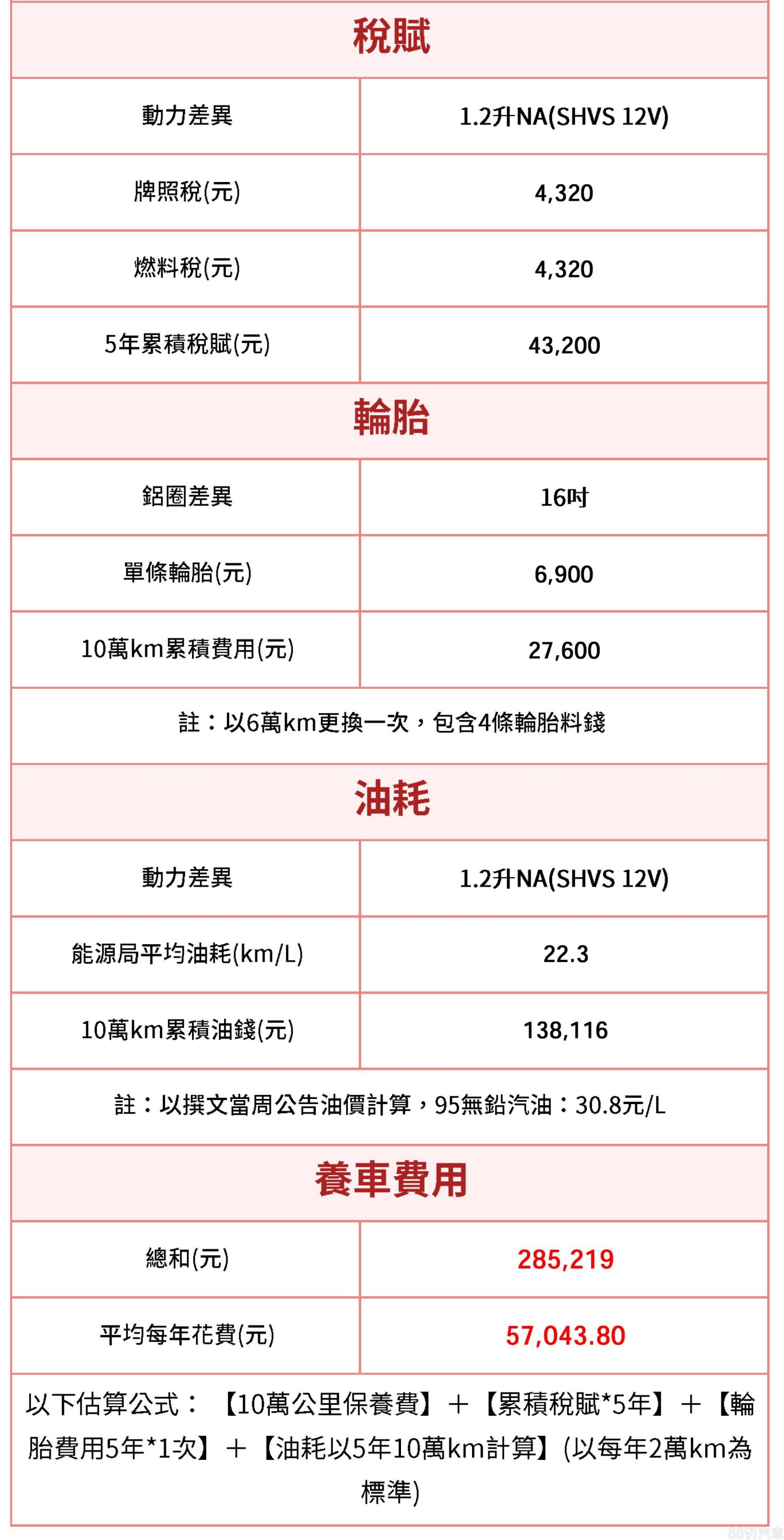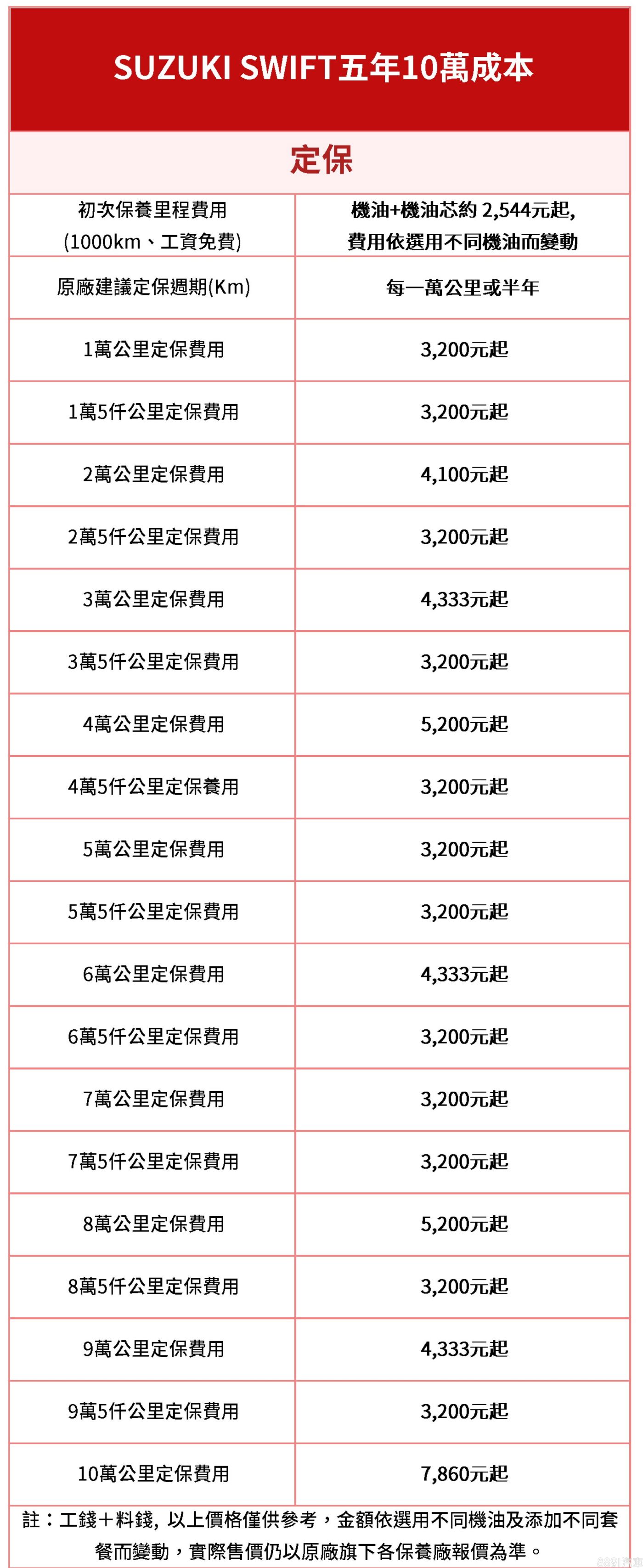 俗話說買車容易養車難,但養SUZUKI SWIFT卻比想像中容易許多,以使用5年、行駛10萬公里做計算,參考原廠保養價格並計算年度稅賦、油錢等費用,開著SUZUKI SWIFT平均每年僅需付出約5.7萬元。其中得利於1.2升小排量低稅金與22.3km/L出色油耗,都讓SUZUKI SWIFT養車成本與國產小車維持相同水準。