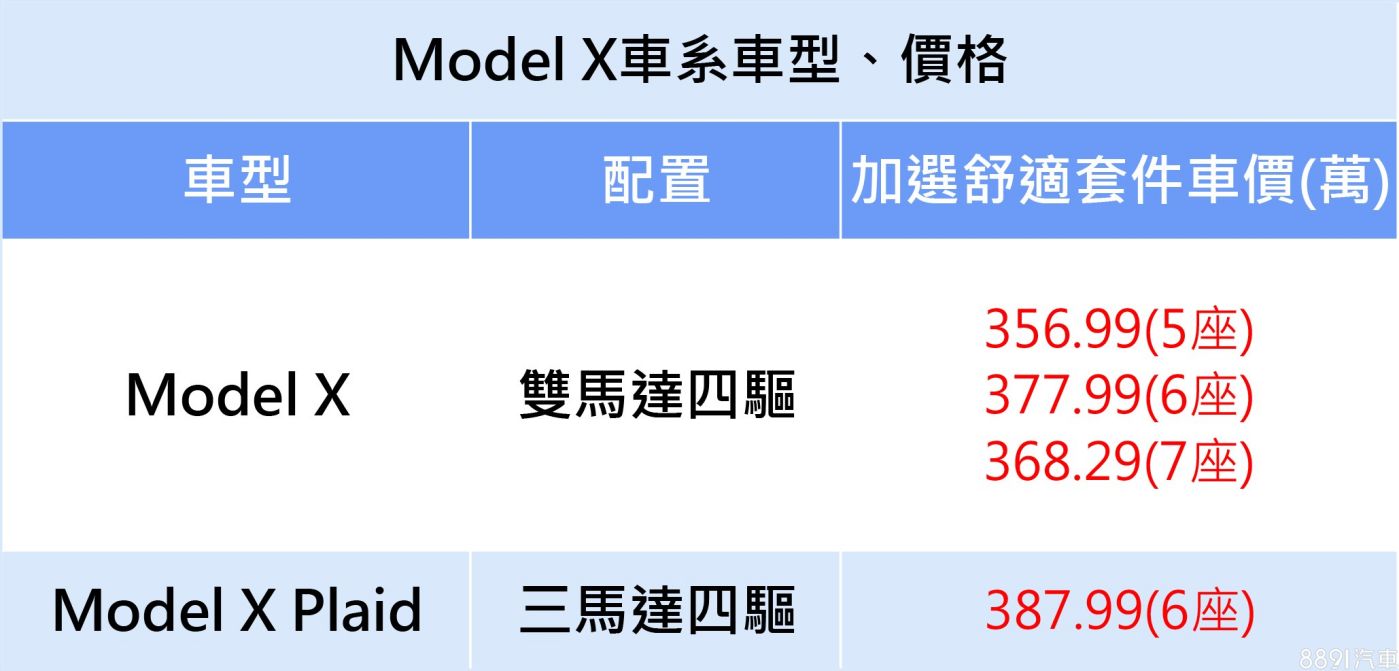新款Model X在台提供雙馬達四驅的Model X標準版,以及三馬達四驅的Model X Plaid,前者除了基本5座配置,還可選擇6座與7座款;後者僅提供6座設定,而國內均需強制選配整合導航、電摺後視鏡、盲點偵測、駕駛座記憶功能等、要價38.4萬的舒適性套件,此次試駕的車型為售價387.99萬元的頂規Model X Plaid,對比同級豪華性能休旅如Audi e-tron S(394萬/503hp)、BMW iX M60(638萬/619hp)、M.Benz EQE 43 4MATIC SUV(預售496萬/476hp),價格和動力都勝出。