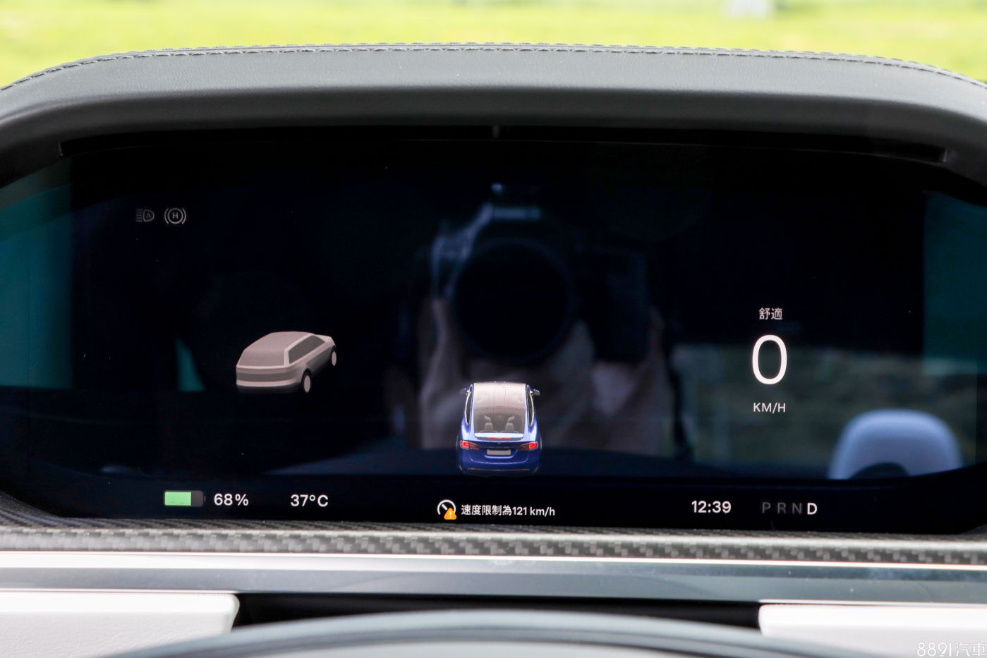 比起Model 3都靠中控螢幕「在撐」,有儀錶還是能讓我更直覺地駕駛,雖然沒有能切換顯示介面的花招,但時間、電量、時速清晰好辨識;中央則為車輛與周遭路況圖示,該有的都有,能顯示附近來車這設計超便利且相當精準。