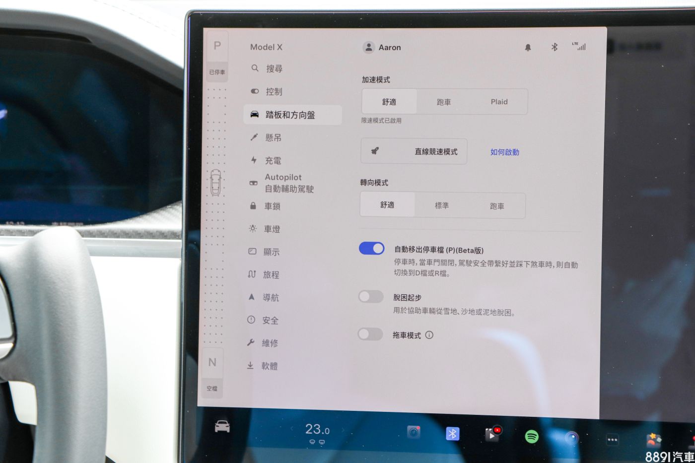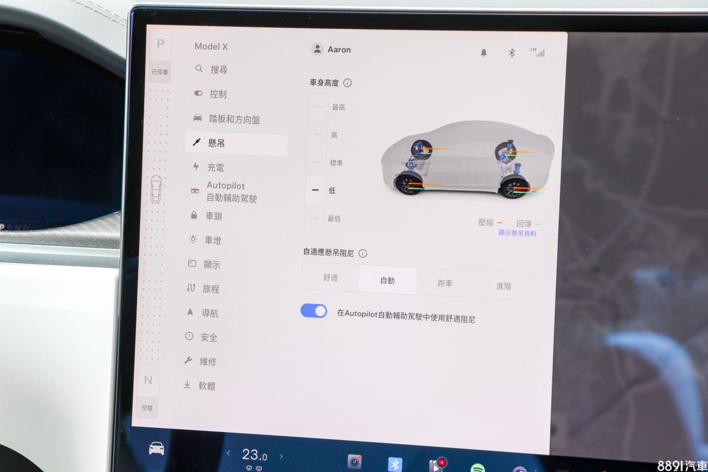 Model X Plaid標配電子氣壓懸吊,面對坑洞路況消弭碎震的吸收性其實不算太好,有時還是會感受到多餘的晃動,阻尼可選四段:舒適、自動、跑車、進階,切換至跑車模式,路感回饋清晰,不過行經彎道或山路時,硬朗的懸吊並未給予期望中的支撐性,雖然知道休旅身型難免受到更多慣性影響,但相較於我開過的同級BMW iX來說,在彎中及時回穩的動態回饋還是略遜一籌。懸吊高度則可選五段:最低、低、標準、高、最高,其中高和最高還能另外設定在某個地點自動抬升。