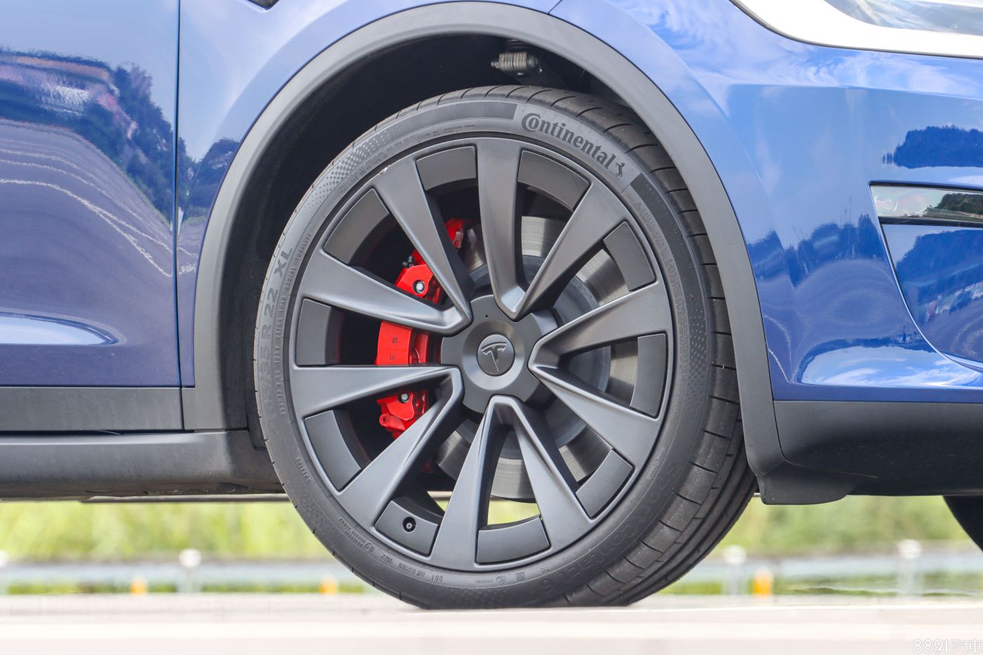 試駕車配置的是需加價17.8萬的22吋多幅式樣,除了氣勢明顯比標配的20吋多出一截,造型也更張狂,配胎則為265/35R22的馬牌SportContact 6,訴求趨於運動化表現。此外,由於是車系性能頂規,Model X Plaid也搭載了能強化煞車性能的紅色前四活塞卡鉗,以及擁有高耐熱能力的來令片。