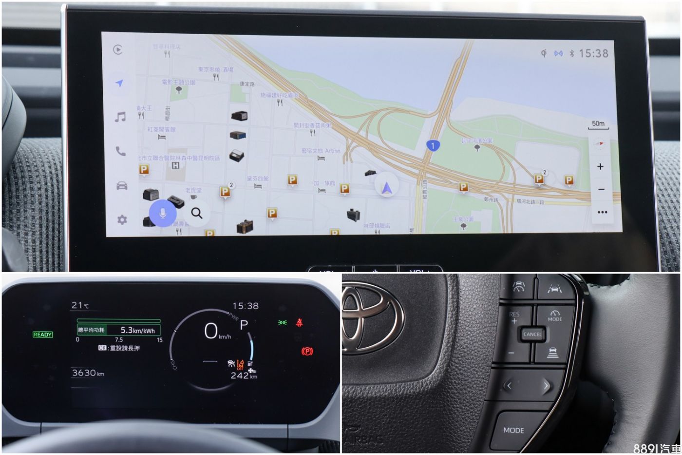 bZ4X搭載12.3吋車載系統,帶有導航、聲控指令、無線Apple CarPlay/有線Android手機連接等功能,有中文化,操作起來也夠流暢。7吋數位儀錶採黑底高反差顯示,資訊判讀夠直覺,車輛設定、電力相關資訊都可在裏頭找到,想開啟全速域ACC、車道偏移輔助,可在方向盤右邊操作。