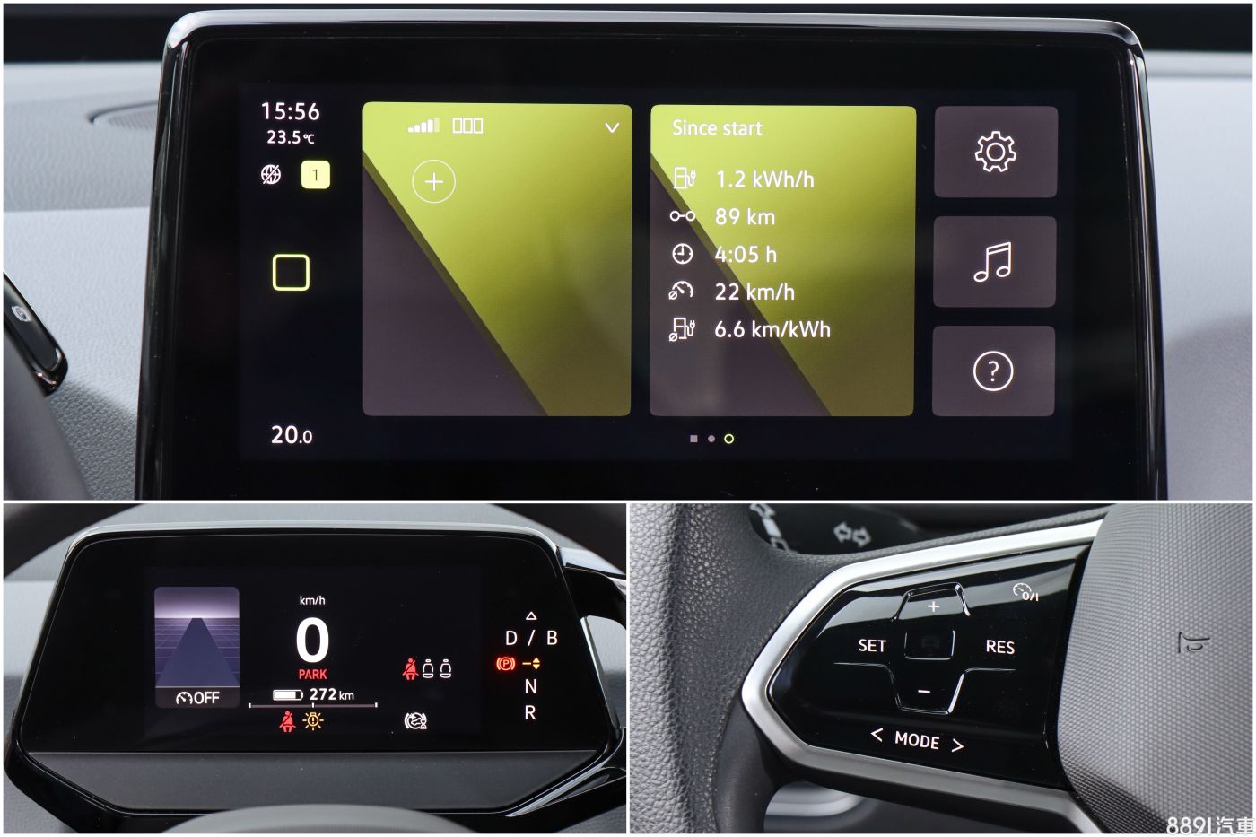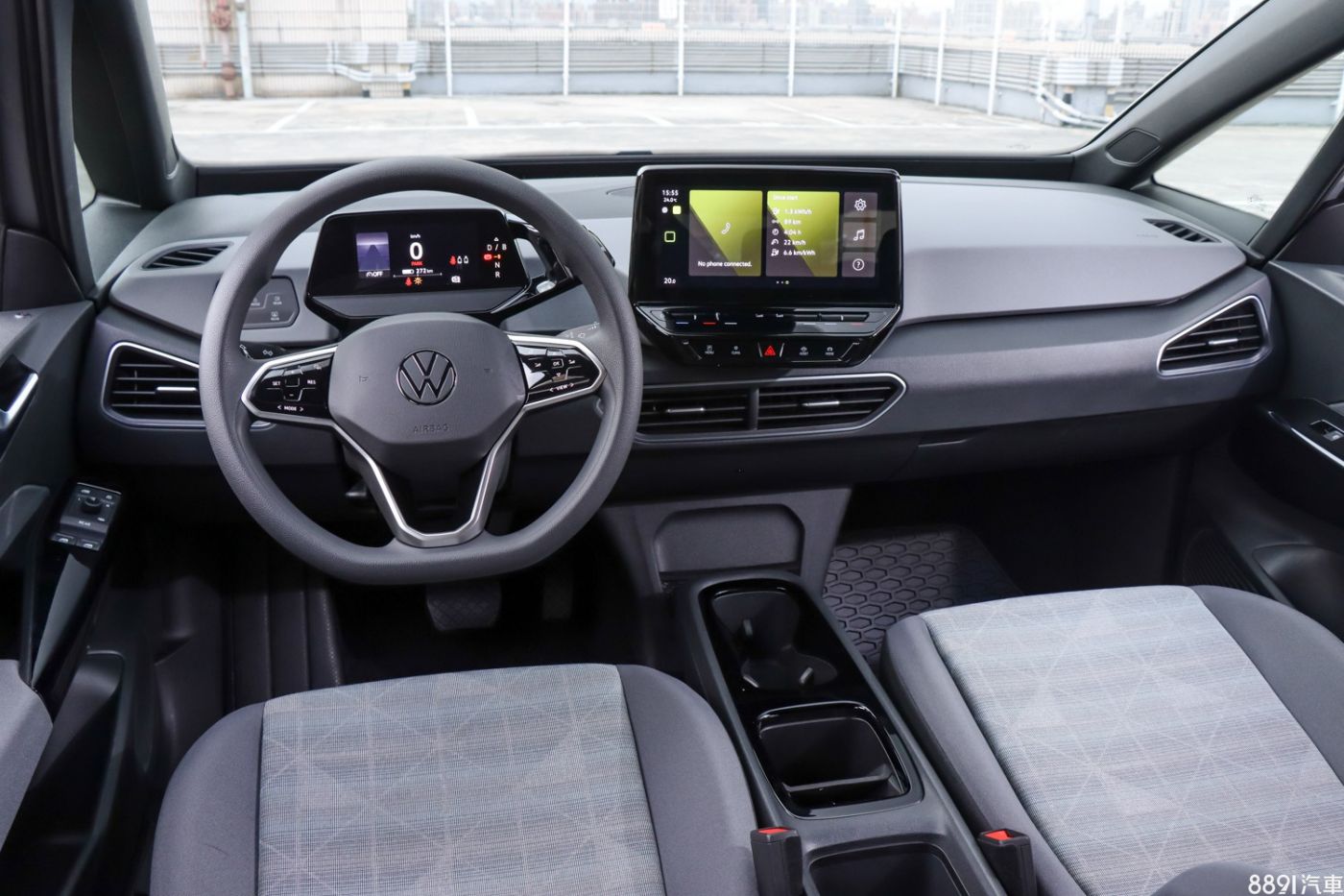 個人相當喜歡ID.3內裝設計,採用全觸控介面,並且將電子排檔整合在儀錶板旁邊,讓中控台看起來相當簡潔,中央鞍座也設計的特別低,讓空間開闊感增加。缺點是用料較為陽春,方向盤採壓花塑料,環艙可見大面積硬質塑膠,加上布質座椅,材質使用不如bZ4X豐富。