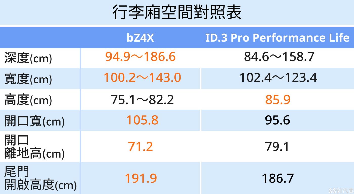 行李廂部分依舊是bZ4X較優,寬度、深度都勝出,且在後座椅背倒平狀態下,有更好的平整性,而且有電動尾門、開口設計佳,綜合空間表現,bZ4X在後座、行李廂都優於對手,是一台適合家庭買家的國民電動車。至於ID.3車格雖然小,但如果是自己開、兩人通勤,前座空間感更勝對手,是放鬆舒適的移動空間。