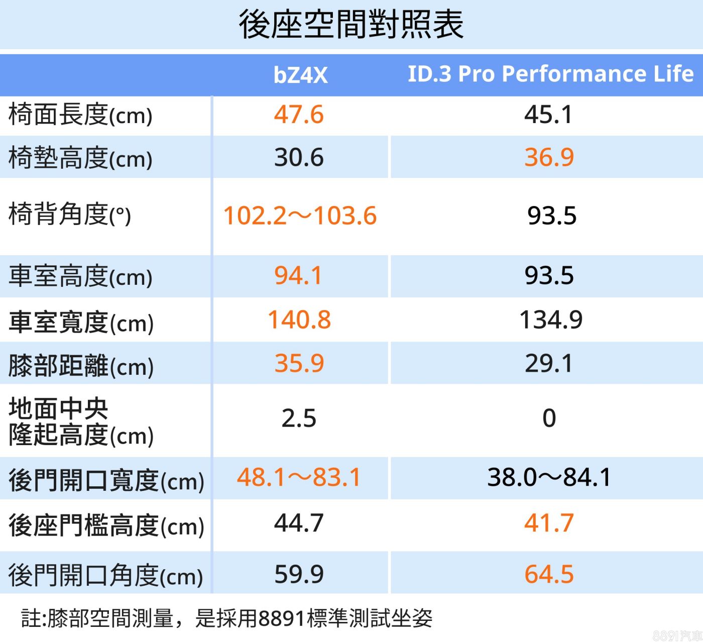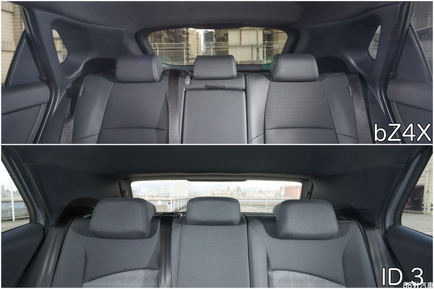 bZ4X多了椅背角度可調設定,但缺點是椅面高度比ID.3低了不少,相較下腿部支撐差了一些。整體來說,bZ4X後座空間不錯,但論人體工學表現、乘坐舒適度,個人認為還是ID.3較為出色。