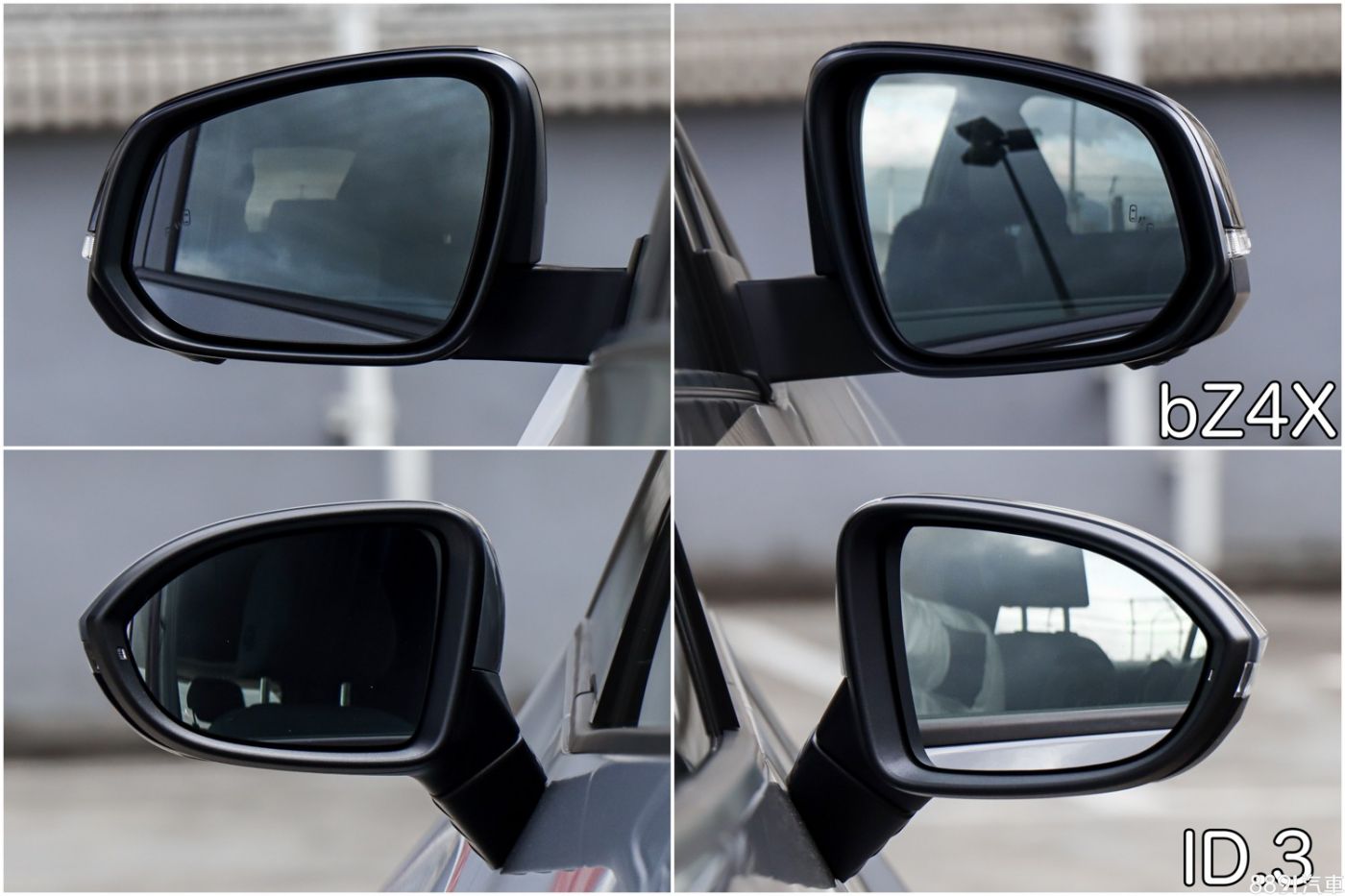 單純以鏡面造型來說,ID.3較為細長,且向外延伸,就實際測量數據左側可視角度達39.2°,但右側僅有14.0°,應加上廣角鏡設計會好一些。bZ4X雖然鏡片外緣也沒有廣角設計,但左右可視角度表現較為平均,左側32.9°、右側 27.2°,且鏡片寬大,看起來也舒服一些,表現比對手出色。