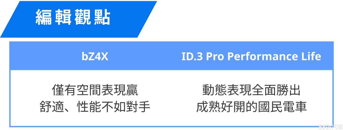 雖然兩車一台是SUV、一台是掀背,卻有很多共通點,都來自大家耳熟能詳的傳統汽車大廠,也同樣是第一部以純電車架構而來,可以說是進入電動車時代的基礎作品,有重要的指標性意義,bZ4X和ID.3擺在一起,已經升級成兩大品牌「造電車」工藝的比較了,也讓我們好奇,誰能做出均衡成熟作品,成為電車時代的國民車。