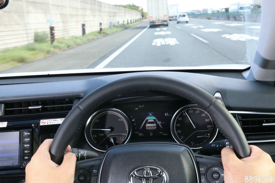 新一代Camry Hybrid標配TSS-P主動安全防護系統,在車頭廠徽設置毫米波雷達,前擋風玻璃上方則有攝影機,兩者協助監控前方狀況,作為碰撞預警系統的判斷(可偵測車輛與行人),還有車道偏移修正,ACC智慧跟車定速也是藉由毫米波雷達與攝影機調,主動調整車速,而與國內現行豐田車款所配置TSS不同的是,本車ACC可對應到完全靜止再起步(靜止後需踩一下油門喚醒系統),不似國內目前豐田車款的ACC在40km/h以下便會自動解除。