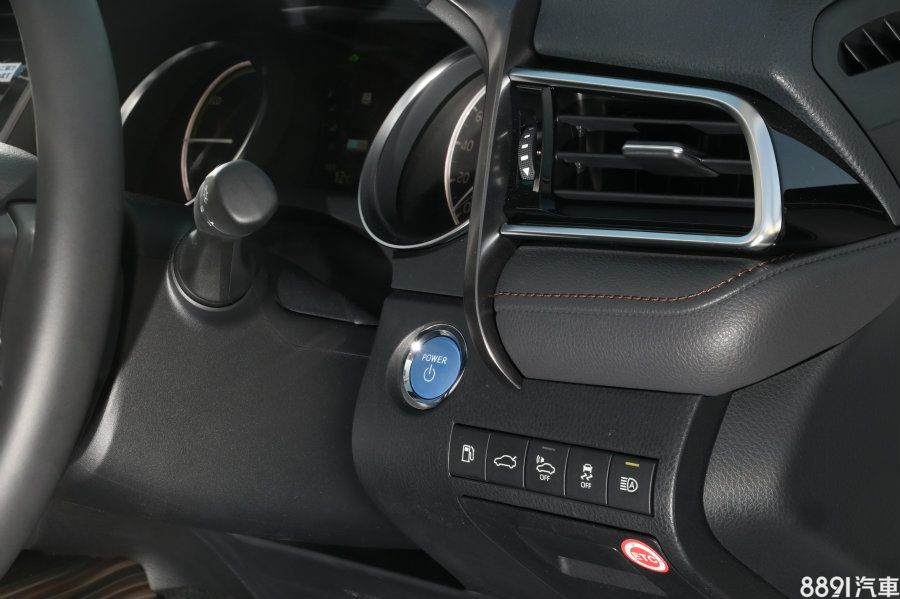 駕駛座另一側按鍵包括自動遠燈、低速鳴蜂器(因油電車慢速無聲,此裝置用以提醒行人)、循跡系統、行李箱開啟,另外油箱開關也設置在此,不像傳統日系車設置在側邊地板,操作起來多了一分便利與高級感。