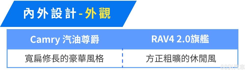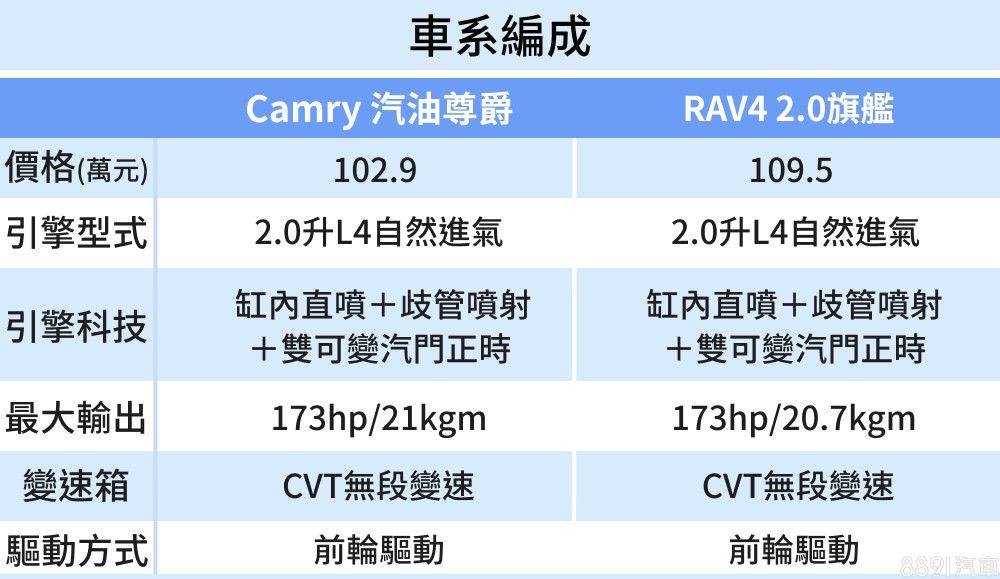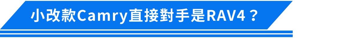 Camry小改款上市後,2.5升汽油版本換成2.0升引擎,降低賦稅負擔,售價也下修至百萬上下,對比同樣日系的Mazda6和Altima,Camry價格顯得更親民,上市首月便帶動汽油款銷量翻倍賣,可說在為數不多的百萬房車市場中,沒有能夠匹敵的對手,同樣在百萬預算,Toyota另提供有熱門休旅RAV4,其汽油2.0前驅車型,不僅與Camry汽油款共享動力及平台架構,就連價格帶也跟Camry幾乎重疊。因此若無特定車型需求,單純想買輛合乎預算的豐田,Camry與RAV4就能同時納入口袋名單。