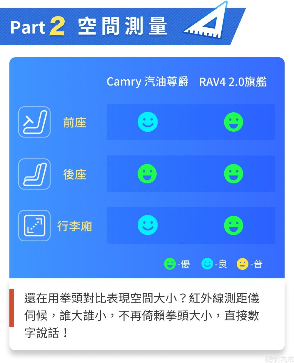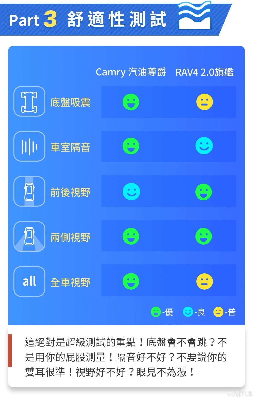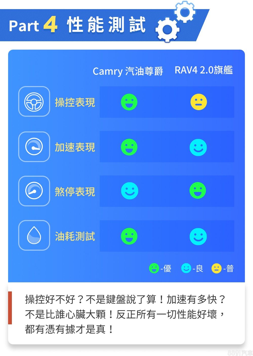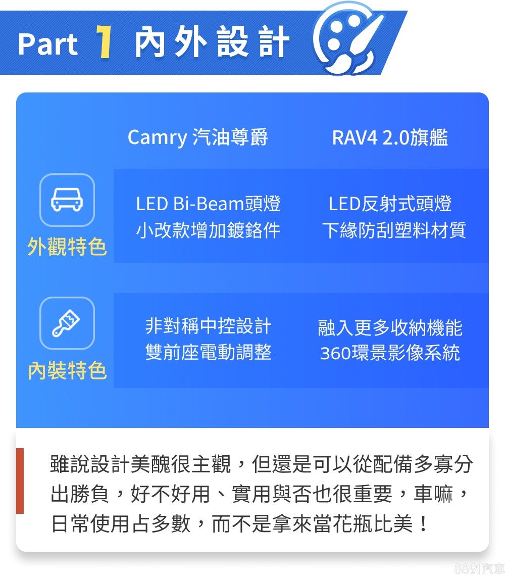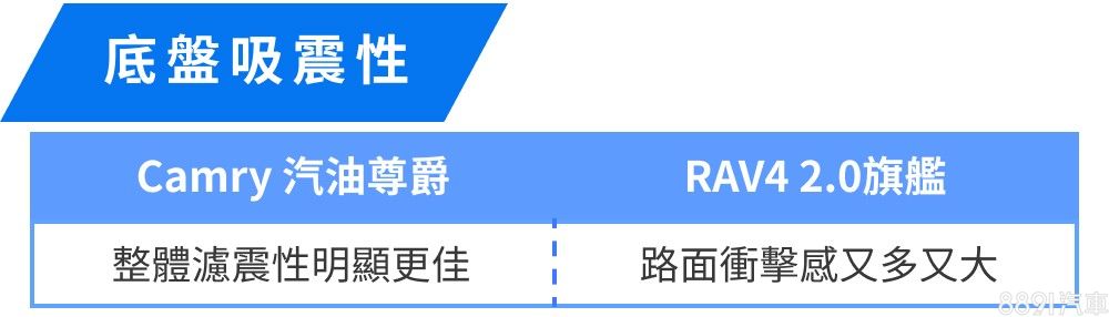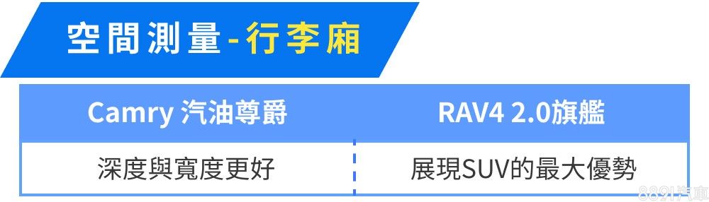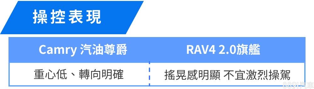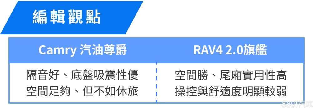 Camry以房車標準而言算頗具水準,但空間表現終究是RAV4的主舞台,RAV4不僅承載量較高,行李廂廂室也較為方正平整,空間利用的靈活度更勝一籌,會更適合有常態載物需求的消費者。至於能耗表現上,RAV4平心而論表現不差,只是Camry成績相對更省油,而兩車即便動力同源,Camry憑藉著低車重、低重心且操控靈活平穩的特色,賽道與加速表現較為突出,不過整體動態測試結果之差異,算是在可預期的範圍內。