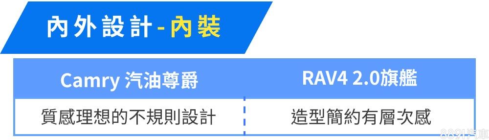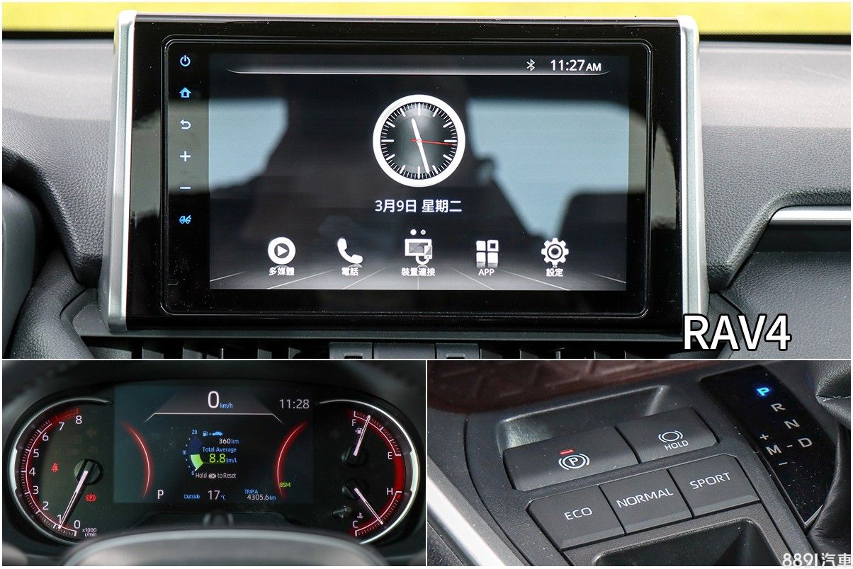 RAV4全車系都採用9吋觸控資訊系統,只是有機型等級的區別,比起Camry少了智慧型手機車載介面,但具備手機熱點連線,能使用愛車秘書和即時生活資訊等內建功能。儀錶以7吋資訊幕搭配左右半環指針錶,雖然螢幕尺寸比Camry 汽油尊爵更大,視覺上較飽滿,卻未提供中文化顯示,使用感受明顯打折。RAV4 2.0旗艦提供三種行車模式,Camry 汽油尊爵則無此功能,是兩車相同動力基礎下的一項差異。